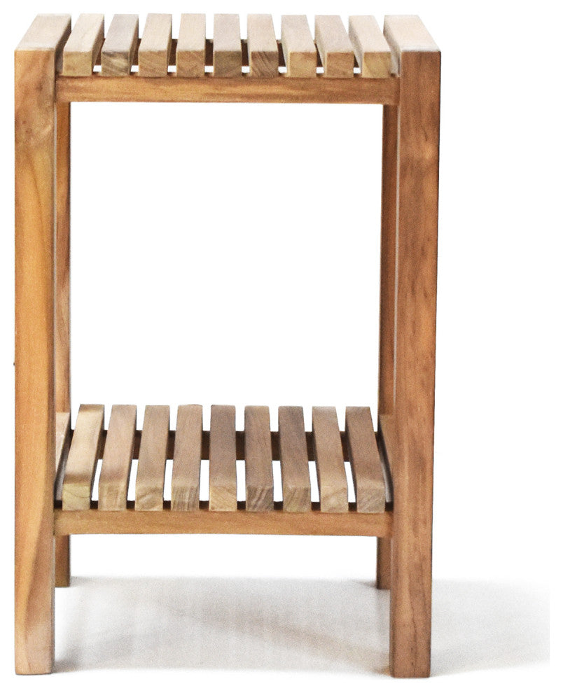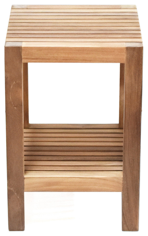 The Fiji teak wood bench is an astoundingly versatile piece of furniture. Use it to revolutionize your shower experience. Teak wood is always warm, and the narrow slats of our Fiji line ensure that water runs off without pooling. Sit down and relax in the shower and let the hot water soothe your muscles without having to stand on your aching feet. Have a seat to wash your feet or shave your legs or simply stand and place one foot on it to do the same. Never again will you have to bend over or awkwardly try to balance on one leg.The shower bench"™s lower shelf provides extra storage for your bath products which won"™t end up falling over the edge of the bathtub.Brighten any other space in your house by adding this gorgeous and functional teak wood bench which can act as a seating piece, a table, or even a shoe rack. It is suitable for use indoors or outdoors because of the waterproof nature of teak wood. The golden-brown teak and smooth clean lines of the Fiji shower bench will integrate perfectly into any classic or modern decor.
