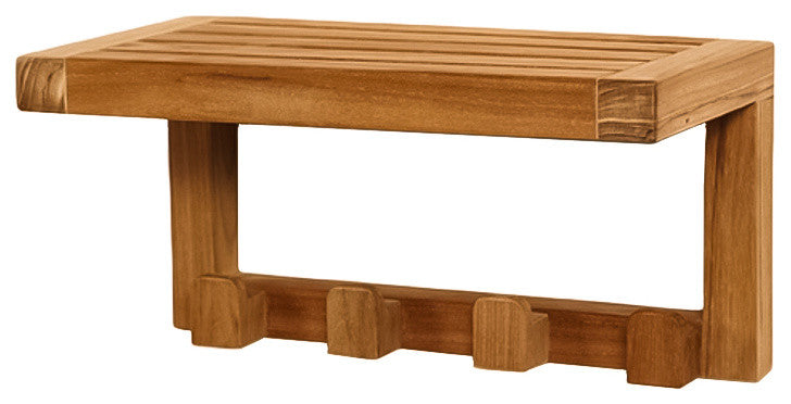No closet at the front door? No problem. Bring function and organization to your entryway with ARB Teak"™s wall shelf equipped with hooks. This piece fits into any style of decor thanks to its natural wood tones and its simple design. Featuring a flat upper shelf for storing hats, books or anything else you need to clear out of the way, it comes with solid square peg hooks for coats, scarves, umbrellas or bags. This shelf isn"™t just perfect for the entryway, it can be installed in your bathroom, a closet, and even outside on the patio.