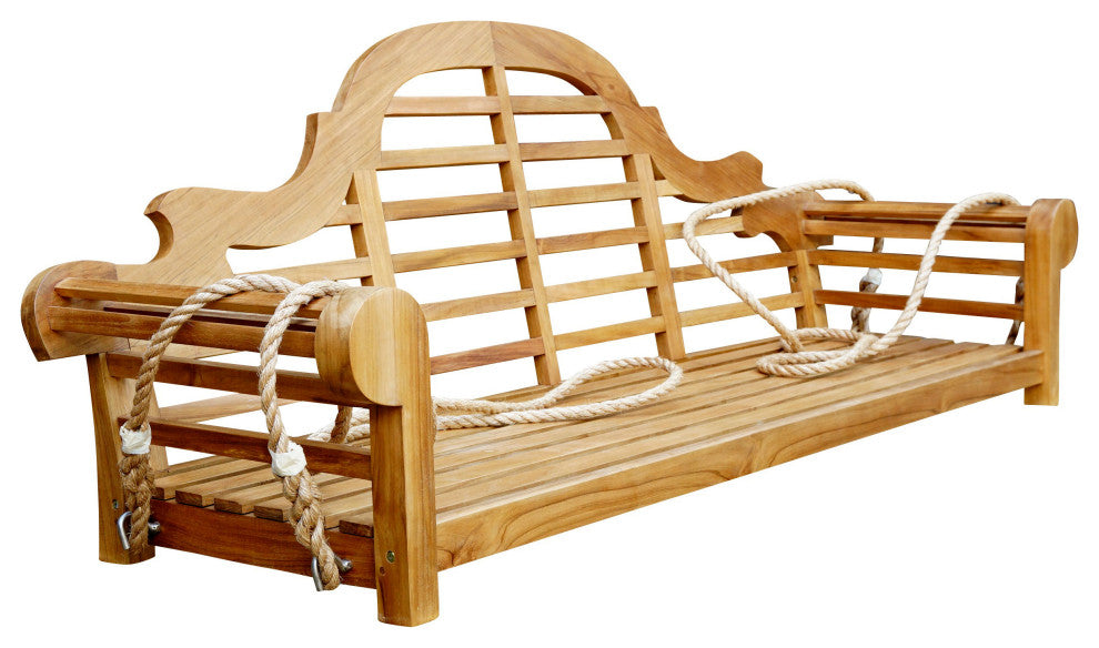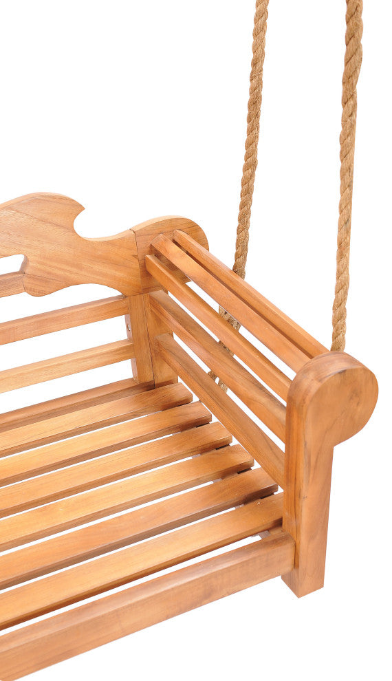 This Teak Swing design is based on a famous design of Sir Edwin Lutyens, one of the most influential and important of all 20th century British architects, which were originally conceived for the garden at Little Thakeham near Storrington, West Sussex, can be found in parks all over the world. This swing reflects the classical, symmetrical style for which Lutyens was known, beautifully enhanced by the natural beauty of the teak wood.Style and function are at the heart of our teak Lutyens inspired collection and now the look can be complete with this double swing. Your sense style doesn''t end when you walk out the door, so we think you deserve your patio furniture to do the same.Features:Solid weather resistant A-grade teak woodBased on famous design by Sir Edwin LutyensRopes and steel hooks includedPremium stainless steel hardwareCan be used indoors or outdoorsEasy set up and assemblyHandmade by skilled artisansDurable constructionMatching all weather cushion available Also available in a triple swing Matching chair, coffee table and benches availableThe hanging ropes are 11 ft so you have about 5.5 ft clearance measured from the arms where the ropes are connected to the ceiling. (Note: because the hanging applications vary, ceiling mounting hardware is not included.)Dimensions are 28" (H) x 66" (W) x 26" (D)Seat Width: 55 in.Seat Depth: 18.5 in.Armrest Height: 11 in.Seat Back Height: 24.25 inches in middle, 14 on sides