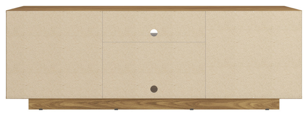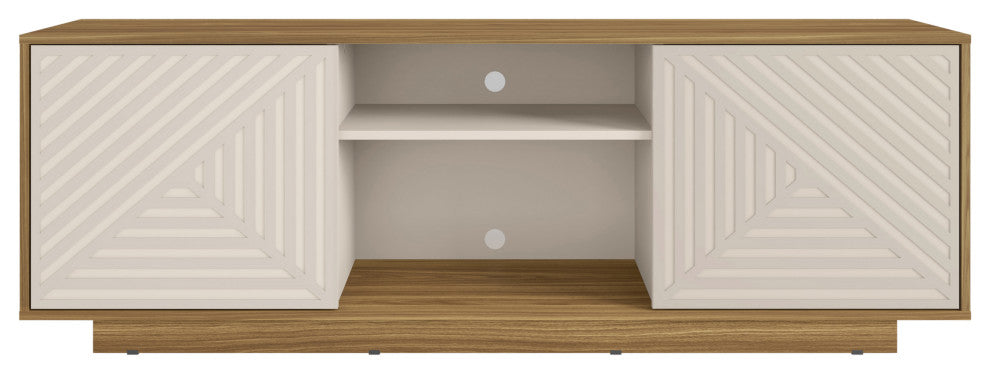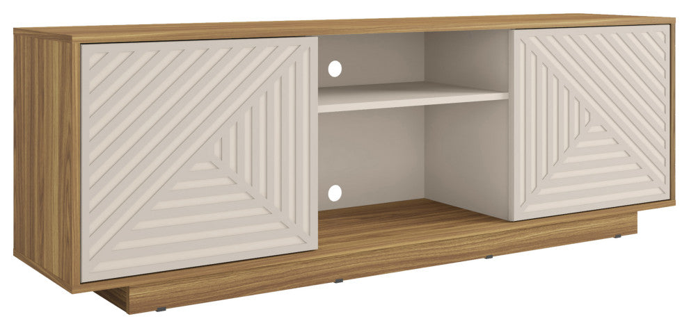 Enhance your space with our elegant modern TV Stand. Available in deep, rich black or a warm oak natural wood finish the patterned doors and clean lines will complement any décor. Behind the striking doors lies a spacious hidden storage area, perfect for tucking away electronics or games. The central open shelving is ideal for displaying items or media components that might require easy access. Whether placed in a modern loft or cozy family room, this tv stand is sure to be a focal point. This TV Stand can hold TV"™s up to 70"� diagonally. The unit is 63"� wide but an overhang on either side is acceptable.