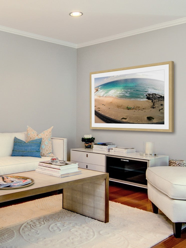 "Telescopic Beach View" Framed Print by Karolis Janulis features vivid tones and supple artistry. Mounted in a gorgeous frame, this 30 inch wide by 20 inch tall piece will be an exceptional addition to any room. Top quality Giclee print on high resolution Archive Paper Artwork by Karolis Janulis Professionally framed and mounted on acid free archive matte High quality durable non-warping frame Arrives ready to hang Includes a certificate of authenticity Made in the USA