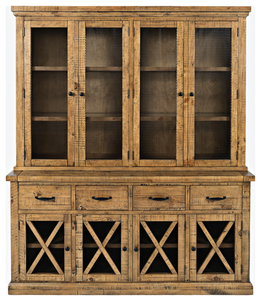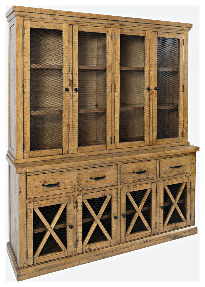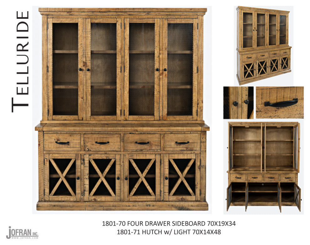Telluride Rustic Distressed Pine Sideboard Buffet Hutch with LED LightsThe Telluride Collection is the essence of rustic country style with distressed solid pine handcrafted into spectacular furniture perfect for any room in your home. Each piece is unique with subtle distressing that brings out the beauty of the full grain natural wood. This Telluride Hutch and Server is a winning combination of our Four Drawer Sideboard and our Telluride Hutch with touch lighting. Together they create a focal point that looks great and provides tons of storage. Standing a combined 82 inches tall, the bottom has plenty of contemporary storage framed with black mesh grill doors; and the top has four beautiful doors with double shelving ready to display your treasures. Fine beveling on top of the unit is another reminder of the fine artisan craftsmanship. Our Telluride Hutch and Server will be a focal point in your room and a conversation piece for years to come.