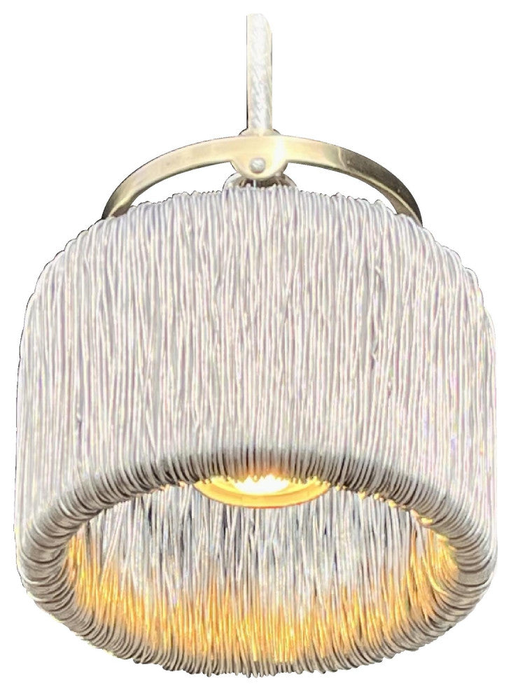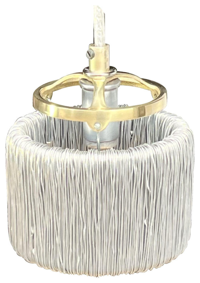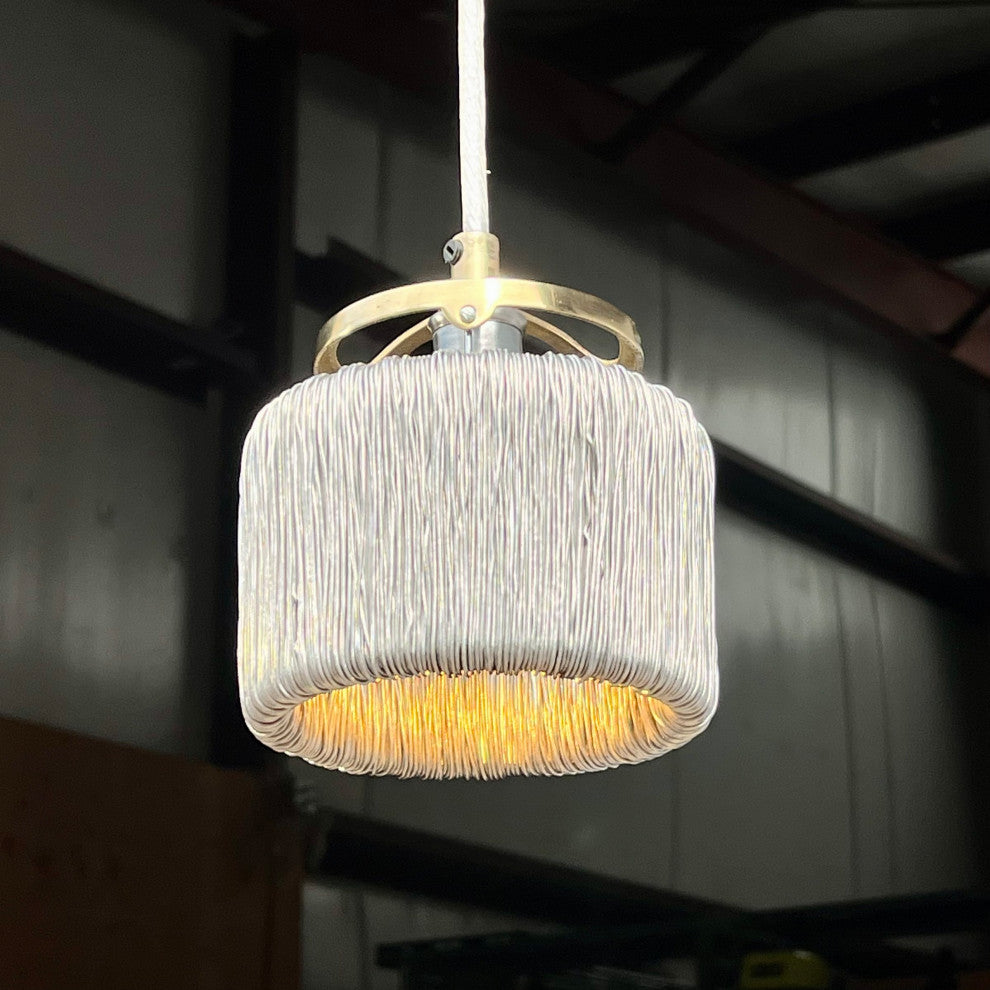 The cylinder shade wrapped with reflective aluminum wire winding is inspired by Tesla"™s Induction Coil Transformer. Suspended by brass hardware inside the wire cylinder, a 500 Lumen LED bulb beams, reflects and shimmers off the wire strands at the bottom of the cylinder to deliver plenty of light to a table or counter a warm reflective glow spills out of the top. This modern aesthetic is easy on the eyes.All Railroadware fixtures are made in the USA meeting all NEC Standards and can be tested & UL labeled if needed for an additional cost. The pendant comes ready to hang with instructions, canopy, hardware and bulb. APPLICATION: Kitchen Island, hallway, living room, dining room, coffee bar, restaurant, foyer, lobby, bedroom... Customers & friends will notice and appreciate the optical performance & origins of these fixtures. Includes: (ready to hang, + Metal coil shade 5" dia. 3 1/2" tall. Total fixture measures 4 1/4" tall. + Metal hardware ring and 3 rods suspend the toroid shade (adj. height) + Cord - 60"³ adj. 3 wire cord (black) additional length available + Base - Candelabra base porcelain socket set + LED Bulb "“ 120V 6W 580 Lumens/ 60W equal, 360 degree, 2700K warm white, + Canopy - Metal 5"³ ceiling canopy, cross bar with two screws and an adjustable cord grip. (black) Weight: 3 LBS Box Size: 6x6x6 Shipping: 2-4 weeks