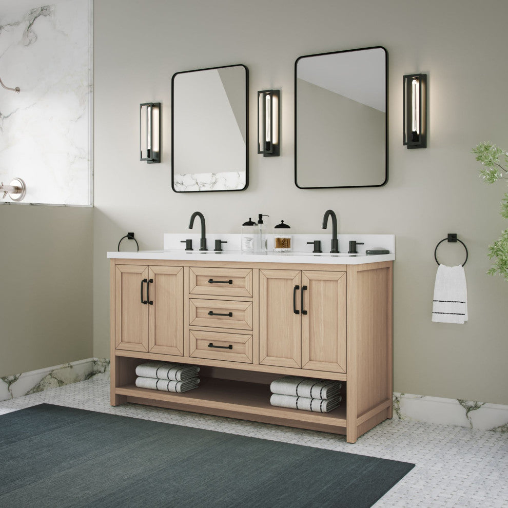 The 60" Asher double sink bathroom vanity will be the centerpiece of your bathroom remodel. Skillfully constructed of solid wood to last a lifetime. Wood is skillfully finished in oak gray. Three solid wood dovetail drawers with full extension glides give you all the necessary storage room for your daily toiletries, coupled with a white quartz countertop to finish off your bathroom remodel.Handcrafted furnitureSolid wood dovetail drawer boxesSoft closing doors and drawers with full extension glidesWood finished to prevent warping, cracking and withstand bathroom humidity levelsWhite quartz countertopAssembled dimensions: 60 in. W x 22 in. D x 34.5 in. HPre drilled for an 8 in. wide spread faucetBlack hardwareFinished in oak grayBacksplash is included a s a gift and will not replaced or refunded.