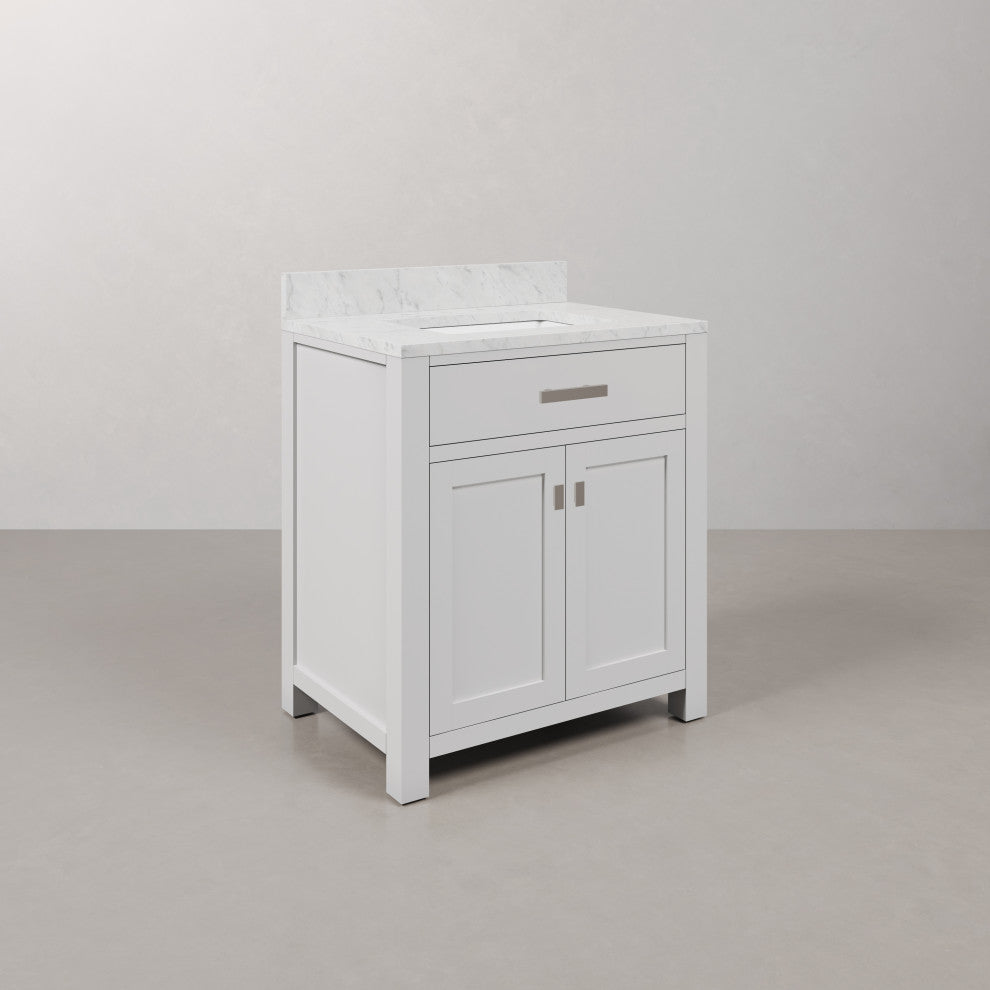 Give your prized pampering possessions a new, spacious home with the Polaris. Its stylish Carrara marble countertop is sealed to perfection so you can easily keep watermarks at bay. But the conveniences go far below the surface. The carefully crafted solid wood base is top-notch and includes soft-close drawers and cabinets that help keep your zen at a ten when putting things away. But the real round of applause goes to the hand-finished construction that prides itself on long-lasting durability and perennial style.Faucet and mirror not includedIncludes countertop, backsplash, undermount sink, handles, hardware, and overflow Large cut-out at the back for plumbing accessSealed marble countertop to prevent watermarks Pre-drilled hole for standard 8" three-hole faucetSoft-closing mechanismHand-finished constructionIncludes rectangular undermount ceramic sink, interior shelving, cut-out for plumbing access, and backsplash100% hardwood construction, kiln-dried to prevent contraction, expansion, and warping.Carrara marble countertop, sealed to prevent staining and watermarks. Pre-drilled countertops for 8" widespread 3-hole lavatory faucet.Protective, multi-step finish process.Vanity comes fully assembled; backsplash must be assembled to the vanity.For the MADISON bathroom vanity collection, a matching wall cabinet is available under SKU: MADISON-TT-W.For the MADISON bathroom vanity collection, a matching free standing linen cabinet is available under SKU: MADISON-LC-W.