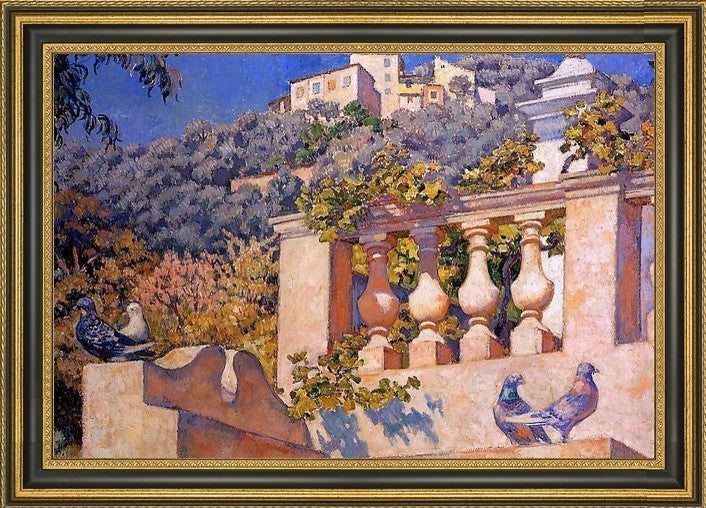 18" x 27" Theo Van Rysselberghe The Balustrade framed premium canvas print reproduced to meet museum quality standards. Our Museum quality canvas prints are produced using high-precision print technology for a more accurate reproduction printed on high quality canvas with fade-resistant, archival inks. Our progressive business model allows us to offer works of art to you at the best wholesale pricing, significantly less than art gallery prices, affordable to all. This artwork is hand stretched onto wooden stretcher bars, then mounted into our 3 3/4" wide gold finish frame with black panel by one of our expert framers. Our framed canvas print comes with hardware, ready to hang on your wall. We present a comprehensive collection of exceptional canvas art reproductions by Theo Van Rysselberghe .