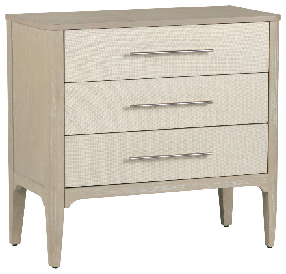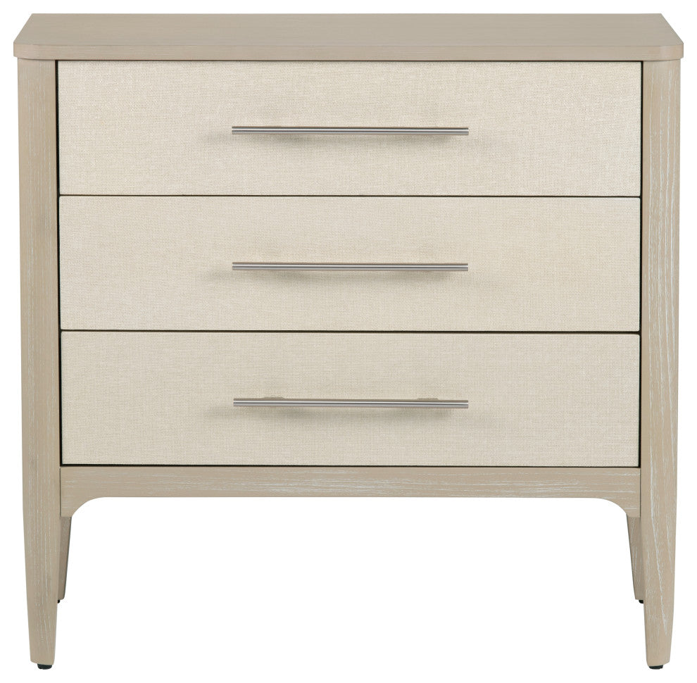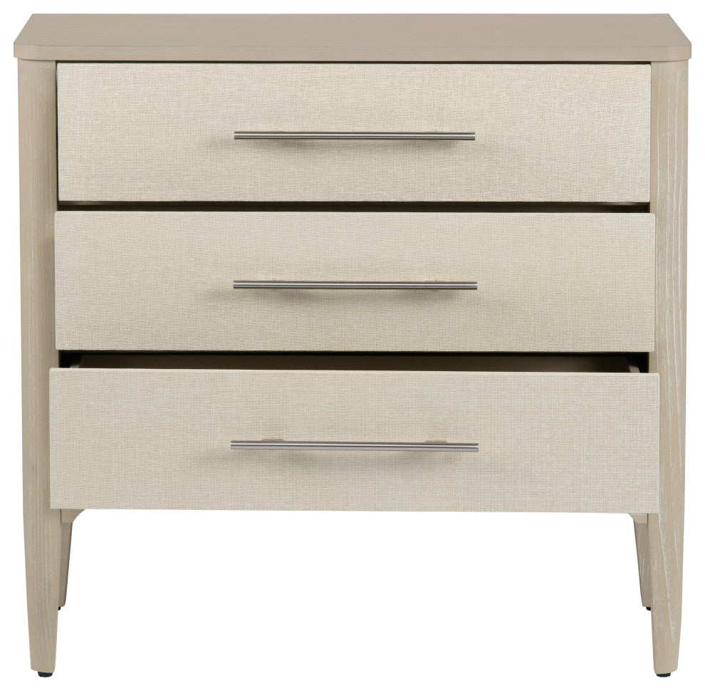 Enhance your space with this stylish chest, thoughtfully designed for functionality and elegance. Constructed from durable rubberwood and white oak veneer, it features textured raffia on the drawer fronts, complemented by a water-based finish in soft off-white and cream tones. The chest includes three spacious drawers with soft-close and metal glides for smooth operation. Sleek metal handles add a modern touch, while floor levelers ensure stability on any surface, blending practicality with timeless charm