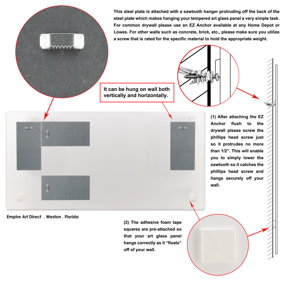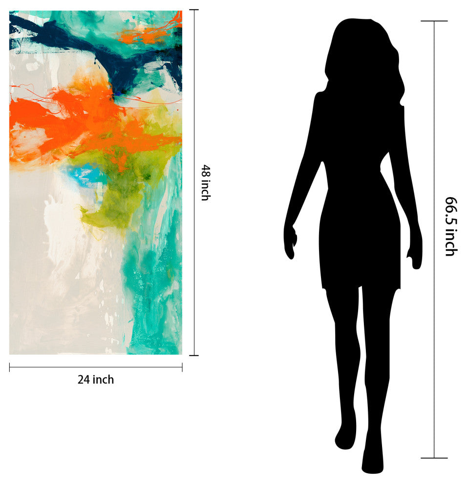 This dynamic piece is awash with colour and shapes, all bright and expressive. Set against a grey background, which itself hides certain forms, these bold blues, greens and oranges seems to clash and cavort like waves on the shore. This abstract image will speak to each viewer differently, but will certainly draw the eye and leave a strong impression. 4 strong steel hangers are attached to the back of the product for quick and easy installation either vertically or horizontally.
