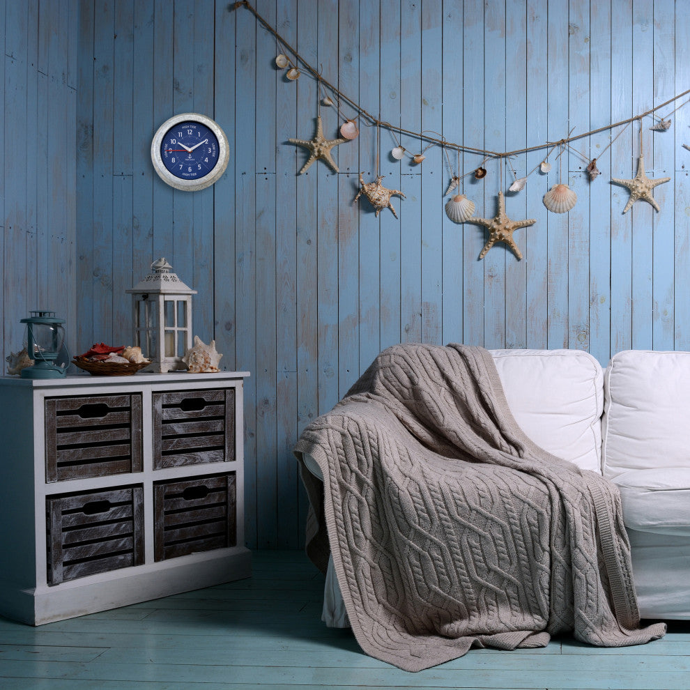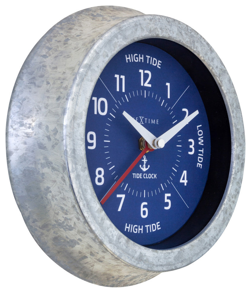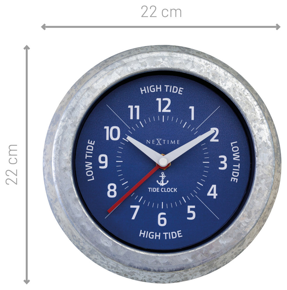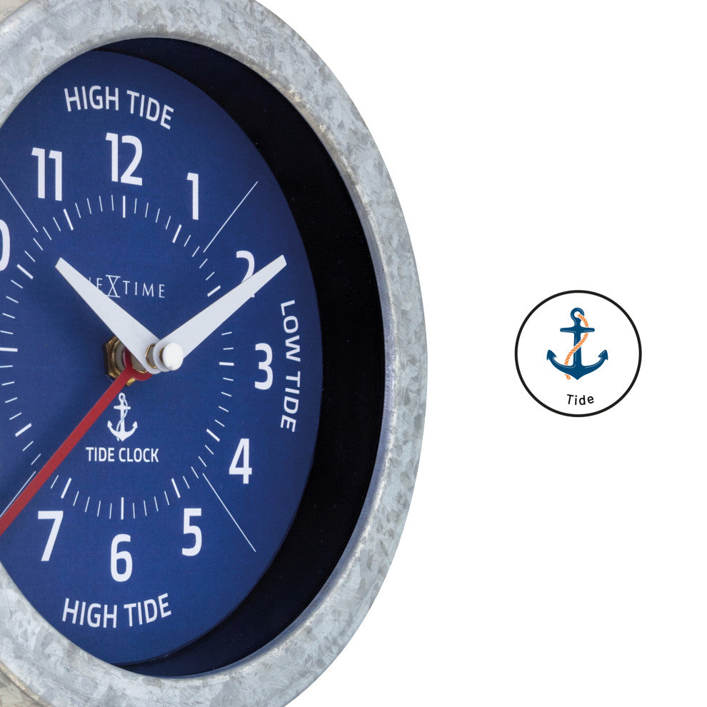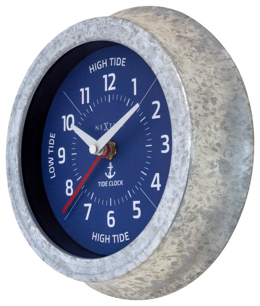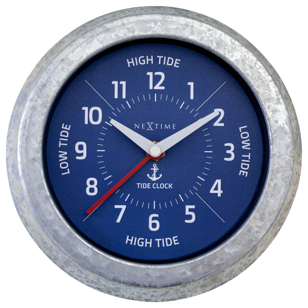 The NeXtime Tide wall clock features a thick galvanized metal frame around a blue or white face with contrasting hands and numbers. The industrial looking clock also serves as a tide clock featuring a red pointer to indicate the state of the tide, (high or low) a useful reference for your water activities. Great for the beach house or boat! The clock runs on 1 x AA battery (not included) Please note that this clock is not waterproof.