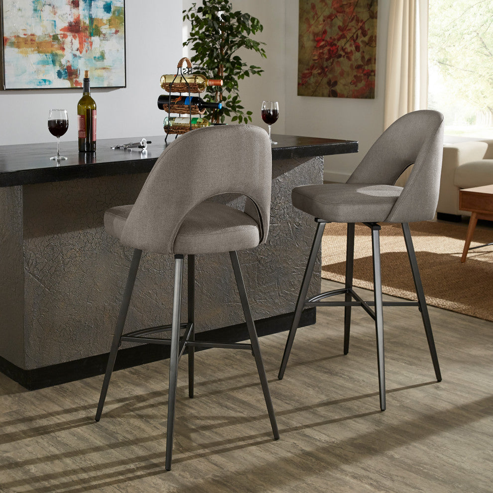 Add some statement-making, contemporary style to your kitchen or bar area with the iNSPIRE Q Metal Fabric Swivel Bar Stools (Set of 2). This set displays classic, retro style with half-circle cutouts and thin yet sturdy black metal legs. Dine casually and comfortably, thanks to soft fabric upholstery, plush foam cushioning, and a convenient swivel feature for easy maneuverability