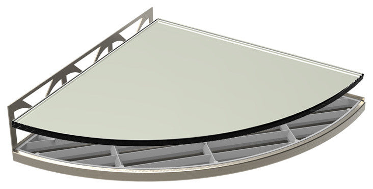 Structural Surfaces?? Claddy T-Shelf With Glass Cover - Polished ChromeInclude Base shelf and Glass Cover - Petra12 Glass colors AvailableDimensions 9" length x 9" width x 2 1/2" heightNo wall anchorsThe Victoria?? Series Structural Surface Shelves is a Structural Support Surface designed to allow any thin, soft, fragile or mosaic tile to be installed horizontally, creating strength and stability.This tray is pre-sloped to ensure that water will never stand. Additionally, the decorative rim and underside is finished, allowing design connections to be made with other metals in the shower (such as plumbing trim). Carefully plan your personality; select shelving organization that provides unlimited tile material options, improving your bathing experience.PermaTile Feature:•  Claddy-T tile-over shelf tray with integrated card slot for thinset motor application (for ceramic, porcelain, natural stone and glass) •  Dimensions 9" length x 9" width x 2 1/2" height •  Tray is stainless steel with front edge and underside polished, brushed or powder coated (oil rub bronze) to match closely with other product finishes •  Specify T400-001 Bella Vetro?? Series - Glass (only) for Claddy-T by color choice for installation or apply your own cut-to-size materials (ceramic, porcelain, natural stone and glass) PermaTile Feature:•  Will not violate waterproofing, plumbing or wiring no more drilling •  Tested by TCNA (Tile Council of North America) Designed specifically for tile applications by tile installers •  Designed specifically for tile professionals •  Encourages quick turnaround where shelving is required •  Eliminates failures resulting from drilling into completed tile work - such as puncturing waterproofing, tile breakage, plumbing and wiring intrusions •  Eliminates the need for wood blocking behind the wall •  Installation can occur within the body of a tile or a grout joint •  Learn how to install in minutes •  No special tools required