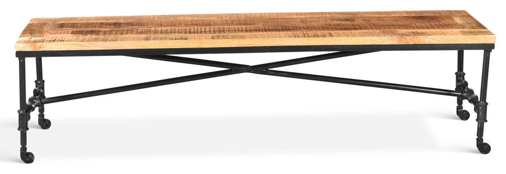Wood and iron bench made of repurposed materials. Legs crafted of salvaged factory iron; top composed of planks of rough sawn mango wood. Welded, riveted solid steel frame stands on caster wheels and is supported by structural cross bracing. Hand-crafted and hand-finished. Goes well with our Reclaimed wood dining table with Wheels.