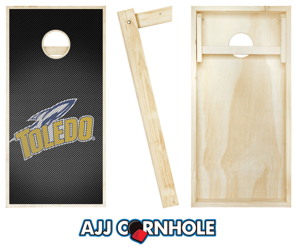 Officially Licensed Toledo Cornhole Set. Show off your Rocket pride at your next cookout or tailgate with our signature slanted design. Cornhole Set comes ready to play right out of the box, no assembly required! Set comes complete with 2 wooden game boards and 8 officially licensed UT bags! Officially Licensed Collegiate ProductRegulation Size (2 Feet x 4 Feet)Tournament Grade ConstructionFolding Legs For Easy StorageAll Wood Construction Set Includes 8 Bags. All sets are made using a premium 2x4 frame and 1/2" sanded plywood playing surface. Each set has folding 2x4 legs secured with galvanized bolts.