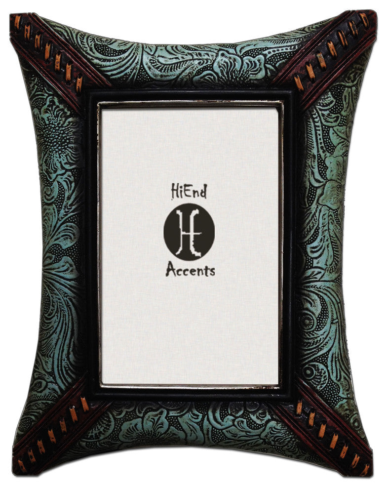 Tooled faux leather 4x6 turquoise frame with contrasting decorative corner lacing adds a colorful western touch to any space. The HiEnd Accents Home D_cor Collection provides all of the little details that bring the style of a home together. Each piece is designed to be tasteful and inspiring, while maintaining quality and affordability.