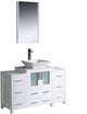 Details of the Fresca Torino 48" White Modern Bathroom Vanity with 2 Side Cabinets & Vessel Sink - FVN62-122412WH-VSLFresca is pleased to usher in a new age of customization with the introduction of its Torino line. The frosted glass panels of the doors balance out the sleek and modern lines of Torino, making it fit perfectly in either ''Town'' or ''Country'' decor. Available in the rich finishes of Espresso, Glossy White, Light Oak and Gray Oak, all of the vanities in the Torino line come with either a ceramic vessel bowl or the option of a sleek modern ceramic integrated sink.Features: Dimensions of Vanity: 48"W x 18.13"D x 35.63"HDimensions of Mirror: 20.75"W x 31.5"H x 1.25"DMaterials: Engineered Wood, Ceramic Sink, Glass/Stone Composite CountertopSoft Closing Doors/DrawersSingle Hole Vessel Faucet Mount (Faucet Shown In Picture May No Longer Be Available So Please Check Compatible Faucet List)Included: Base Cabinet, Side Cabinets, Countertops, Sink, Faucet, Mirror, P-trap, Pop-Up Drain and Installation HardwareSink Color: WhiteSink Dimension: 15"x15"x4"Overflow: NoFinish Color: WhiteFFT3112BN Features: - Dimensions: 2"W x 5.3"D x 12.3"H - Spout Height: 9.8" - Spout Reach: 4.3" - Finish: Brushed Nickel - Ceramic Mixing Valve - 1/2" - 14 NPS Connection - All Mounting Hardware Included