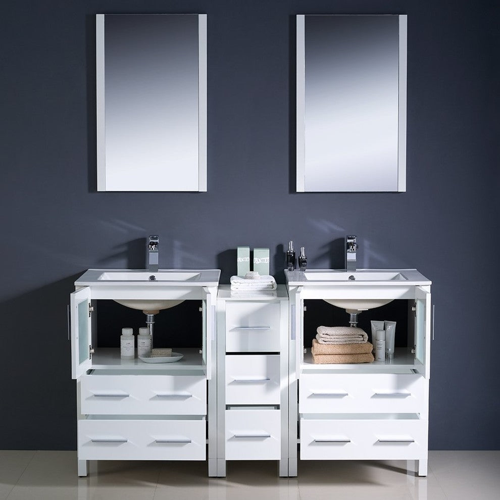 Details of the Fresca Torino 60" White Modern Double Sink Bathroom Vanity with Side Cabinet & Integrated Sinks - FVN62-241224WH-UNSFresca is pleased to usher in a new age of customization with the introduction of its Torino line. The frosted glass panels of the doors balance out the sleek and modern lines of Torino, making it fit perfectly in either ''Town'' or ''Country'' decor. Available in the rich finishes of Espresso, Glossy White, Light Oak and Gray Oak, all of the vanities in the Torino line come with either a ceramic vessel bowl or the option of a sleek modern ceramic integrated sink.Features: Dimensions of Vanity: 60"W x 18.13"D x 33.75"HDimensions of Mirror (x2): 20.75"W x 31.5"H x 1.25"DMaterials: Engineered Wood, Ceramic Sinks with Overflow, Glass/Stone Composite Countertop (12" Cabinet)Soft Closing Doors/DrawersSingle Hole Faucet Mounts (Faucets Shown In Picture May No Longer Be Available So Please Check Compatible Faucet List)Included: Base Cabinets, Side Cabinet, Countertops, Sinks, Faucets, Mirrors, P-traps, Pop-Up Drains and Installation HardwareSink Color: WhiteSink Dimension: 16.5"x11"x5"Overflow: YesFinish Color: WhiteFFT1030CH Features: - Dimensions: 1.63"W x 6"D x 6.75"H - Spout Height: 3.38" - Spout Reach: 4.38" - Finish: Chrome - Ceramic Mixing Valve - 1/2" - 14 NPS Connection - All Mounting Hardware Included