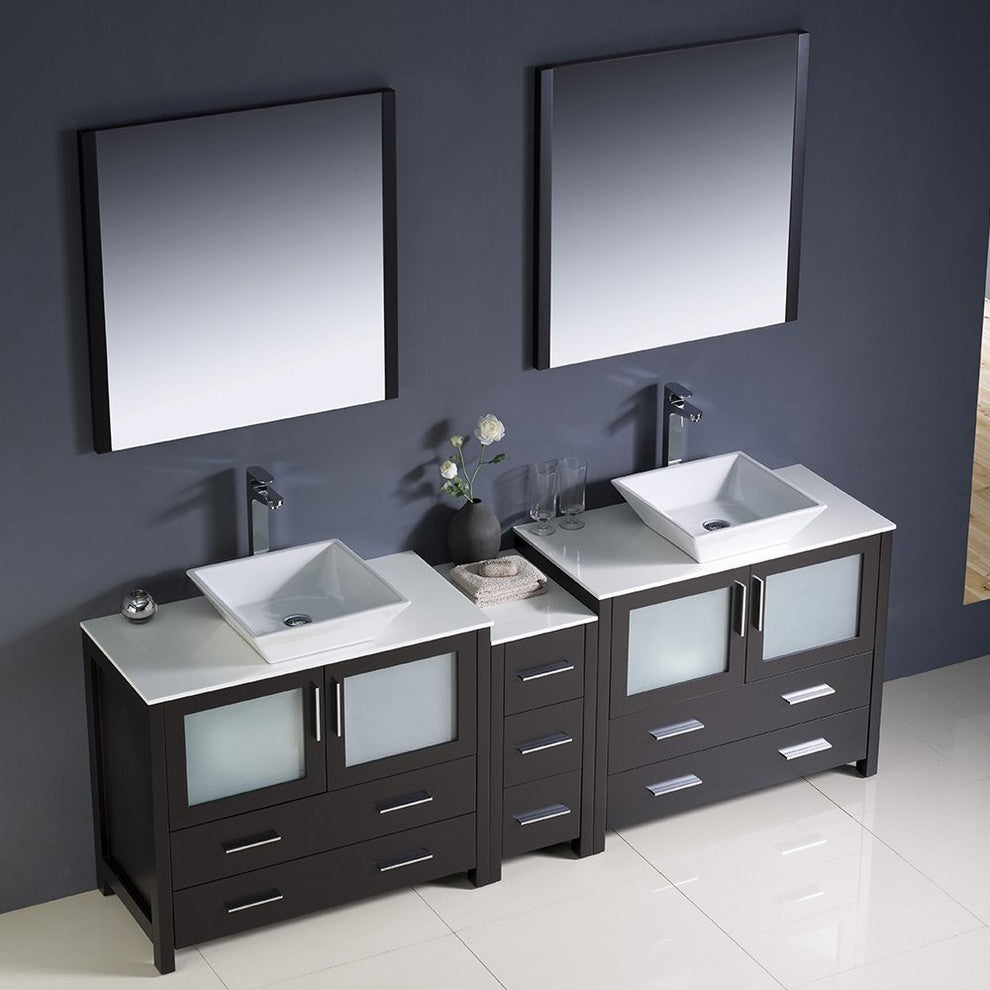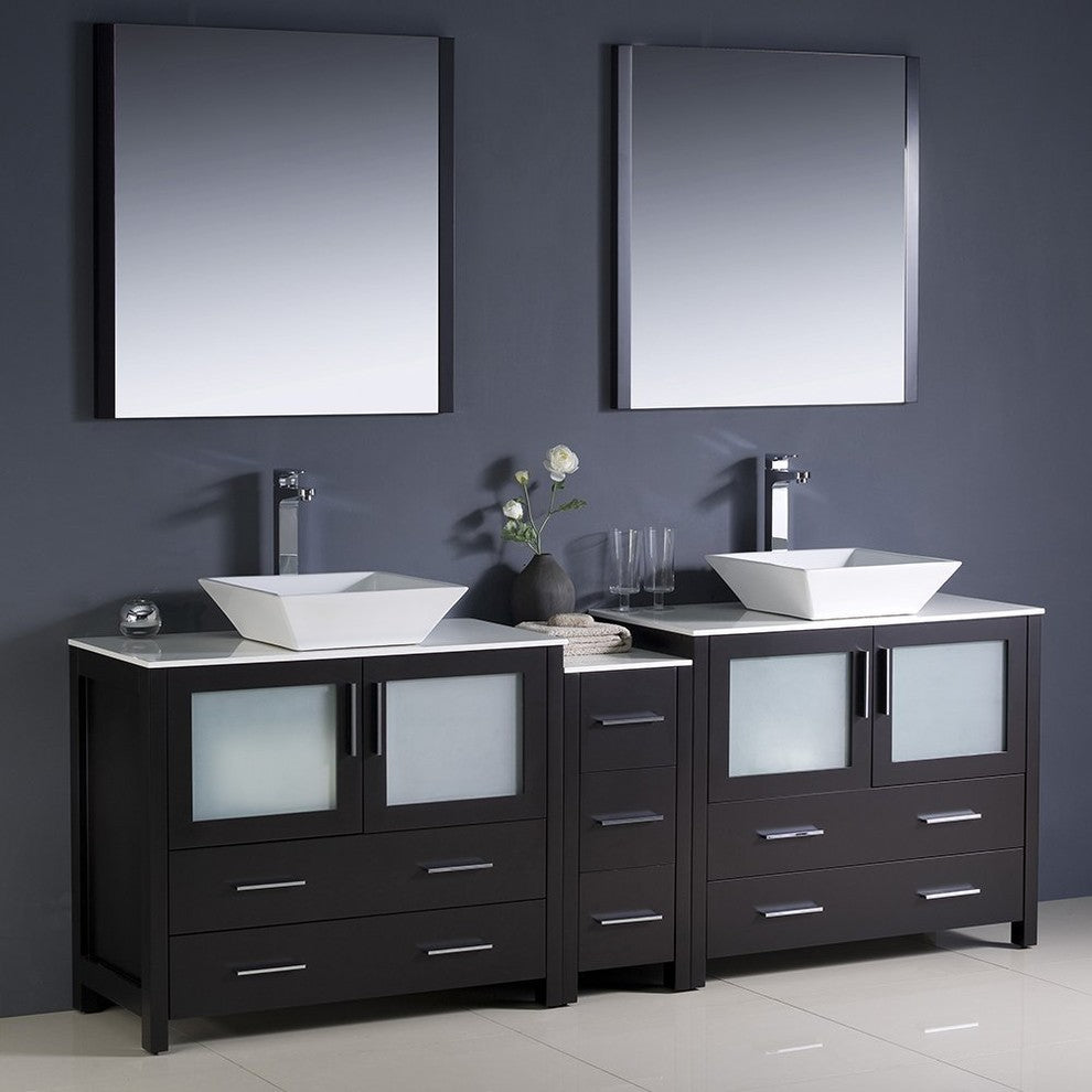 Details of the Fresca Torino 84" Espresso Modern Double Sink Bathroom Vanity with Side Cabinet & Vessel Sinks - FVN62-361236ES-VSLFresca is pleased to usher in a new age of customization with the introduction of its Torino line. The frosted glass panels of the doors balance out the sleek and modern lines of Torino, making it fit perfectly in either ''Town'' or ''Country'' decor. Available in the rich finishes of Espresso, Glossy White, Light Oak and Gray Oak, all of the vanities in the Torino line come with either a ceramic vessel bowl or the option of a sleek modern ceramic integrated sink.Features: Dimensions of Vanity: 83.5"W x 18.13"D x 35.63"HDimensions of Mirror (x2): 31.5"W x 31.5"H x 1.25"DMaterials: Engineered Wood, Ceramic Sinks, Glass/Stone Composite CountertopSoft Closing Doors/DrawersSingle Hole Vessel Faucet Mounts (Faucets Shown In Picture May No Longer Be Available So Please Check Compatible Faucet List)Included: Base Cabinets, Side Cabinet, Countertops, Sinks, Faucets, Mirrors, P-traps, Pop-Up Drains and Installation HardwareSink Color: WhiteSink Dimension: 15"x15"x4"Overflow: NoFinish Color: EspressoFFT1044CH Features: - Dimensions: 1.75"W x 6.13"D x 13.25"H - Spout Height: 9" - Spout Reach: 5.75" - Finish: Chrome - Ceramic Mixing Valve - 1/2" - 14 NPS Connection - All Mounting Hardware Included