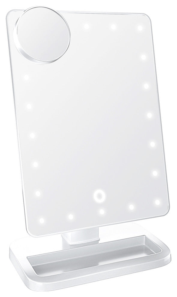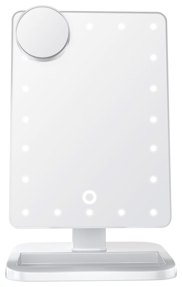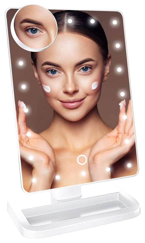 SMART TOUCH MIRROR: This tabletop makeup mirror has 20 energy-saving bright white LED strips. To turn the mirror on or off, simply tap the touch-sensitive power switch on the mirror surface or hold it to adjust the brightness