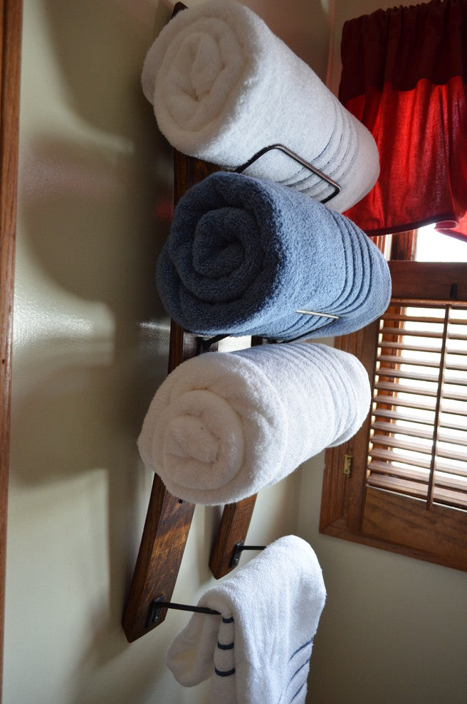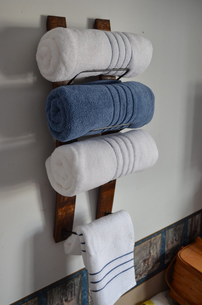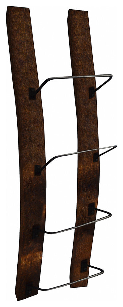 Wine Stave Towel RackSimilar to a wine stave wine rack, I''ve made this a bit shorter, approximately 29" long and I''ve expanded the cradle to 8" to better hold your towels. The shorter length also allows it to sit closer to the wall. Holds up to 4 good size towels or 3 towels and a hand towel on the bottom.Beautiful wood staves, stained a nice English Chestnut, but could also be stained a dark Expresso, if requested. Everything is carefully crafted from choosing the barrel to welding each cradle, the cradles are painted a nice textured black.Approx: 29" high x 10"wide, comes with hooks on back and wall anchors to hang.