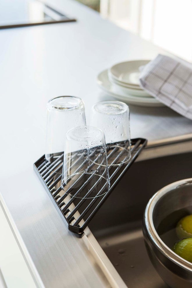Put the corner of your sink to work. A petite corner-shaped rack that fits neatly on the side of your sink and it can store and dry all kinds of things: soap and sponges and odd glasses and dish rack overflow. [Details]