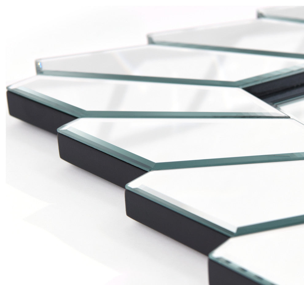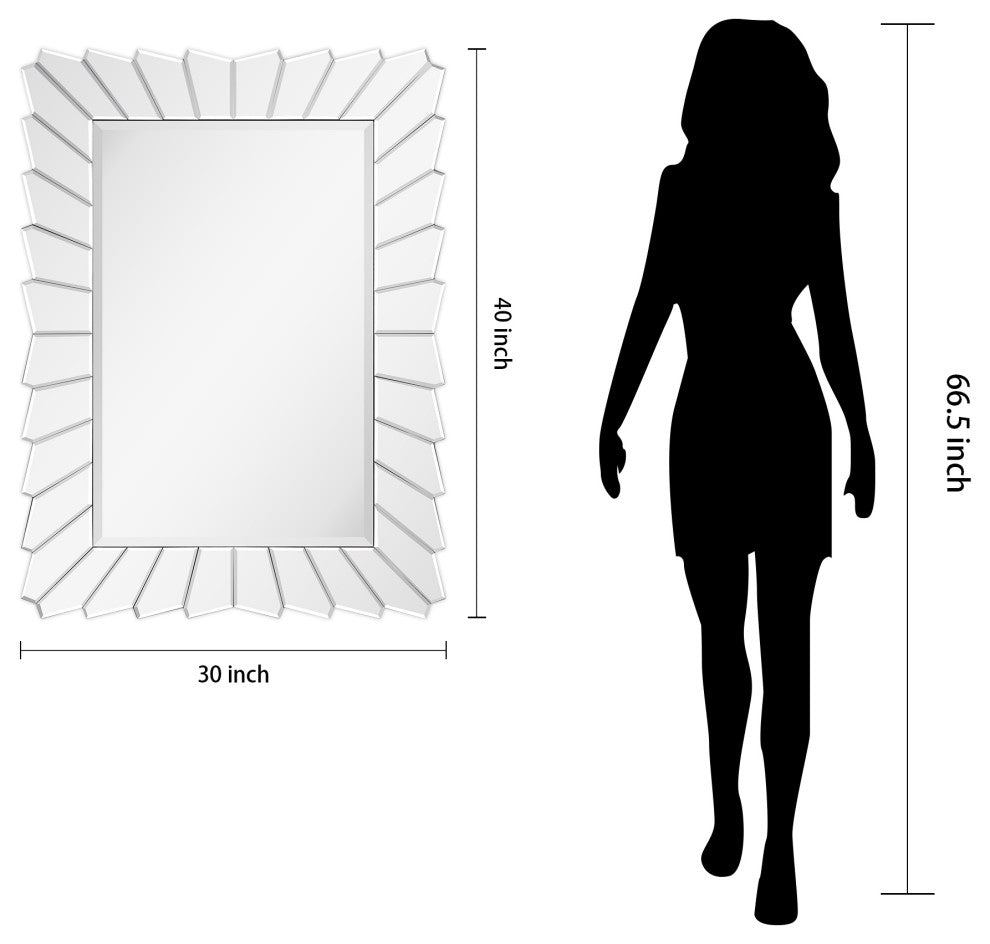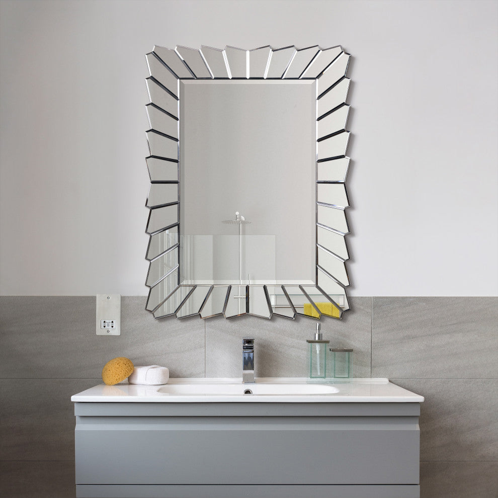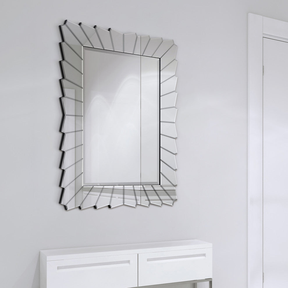 New to the Mirror on Mirror collection is this large, rectangular mirror surrounded by an alternating, clear mirror cut giving this piece a sophisticated, exotic feel. Measuring 30"�x 40"� this beveled mirror comes with 4 pre-attached D-rings on the back, ready to be mounted vertically or horizontally, based on preference, making this mirror extremely versatile and functional.