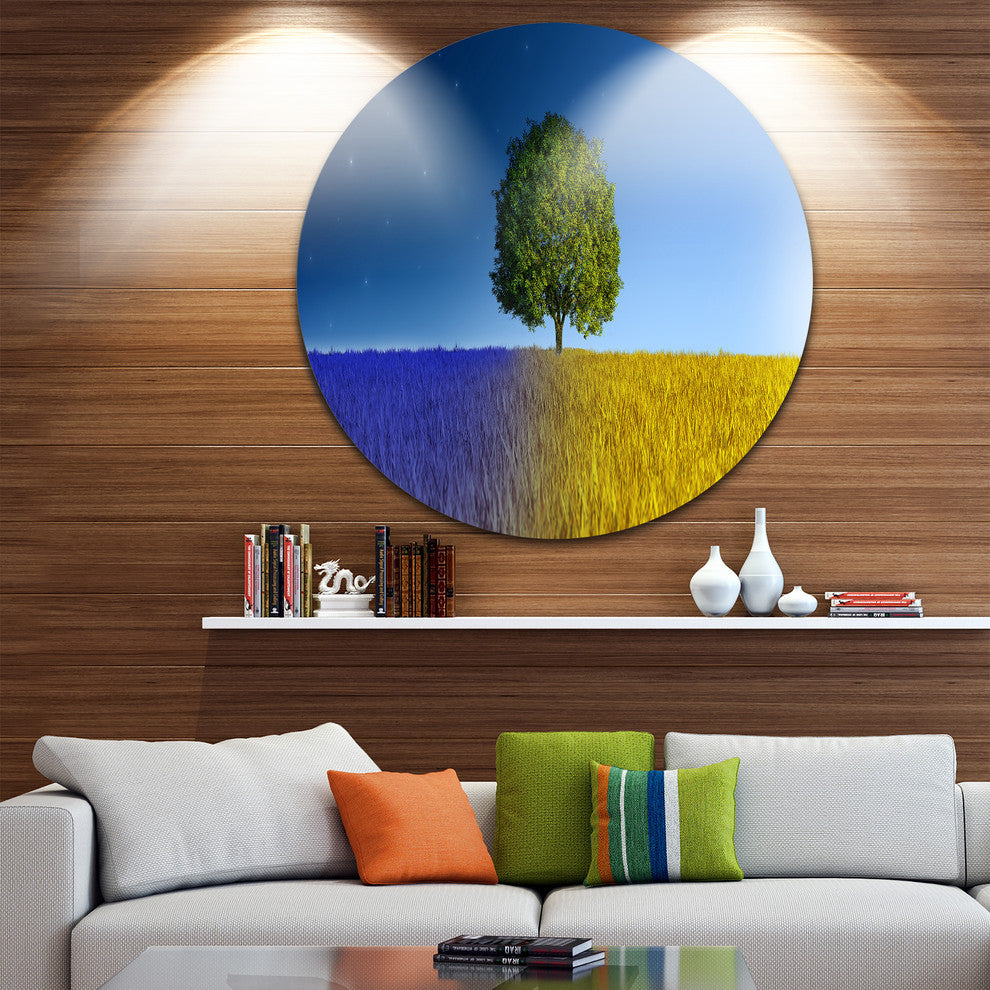 Tree In Night And Day, Landscape Art Round Metal Wall Art, 11"