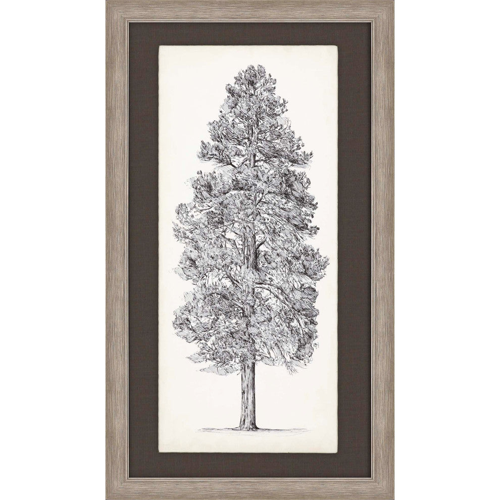 Tree sketch is matted in a hand-wrapped fabric mat. Framed in a distressed silver finish molding.