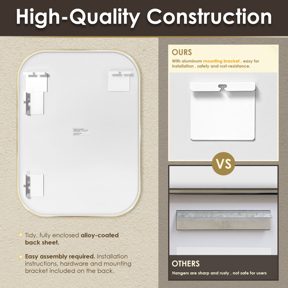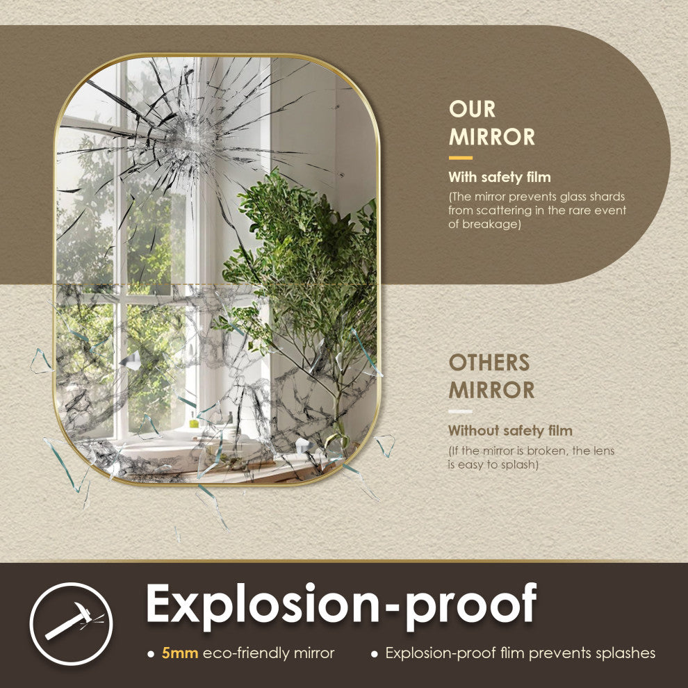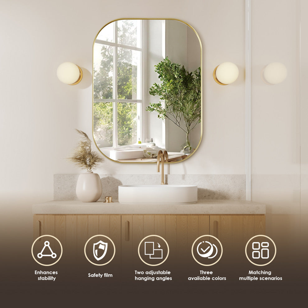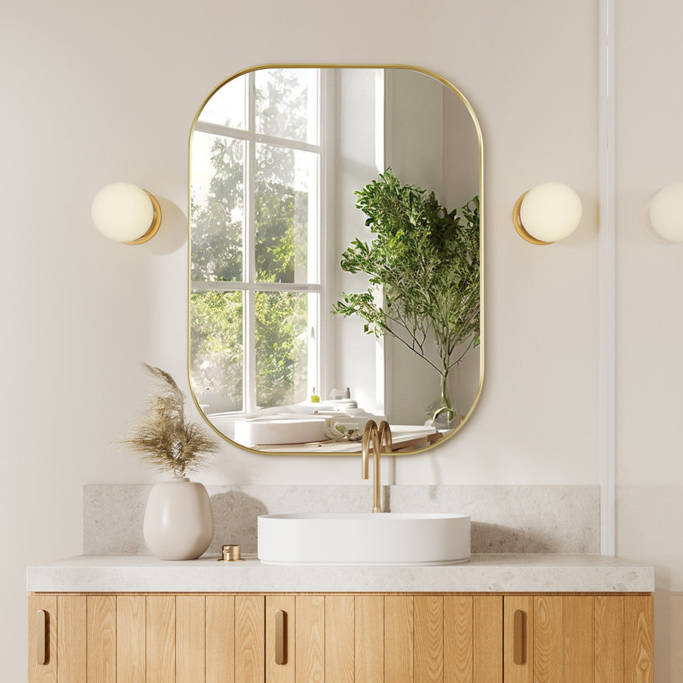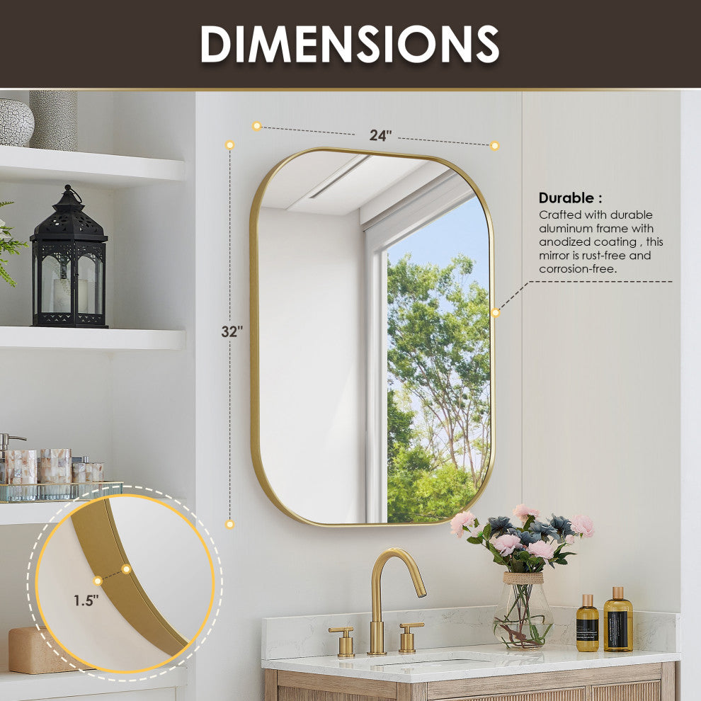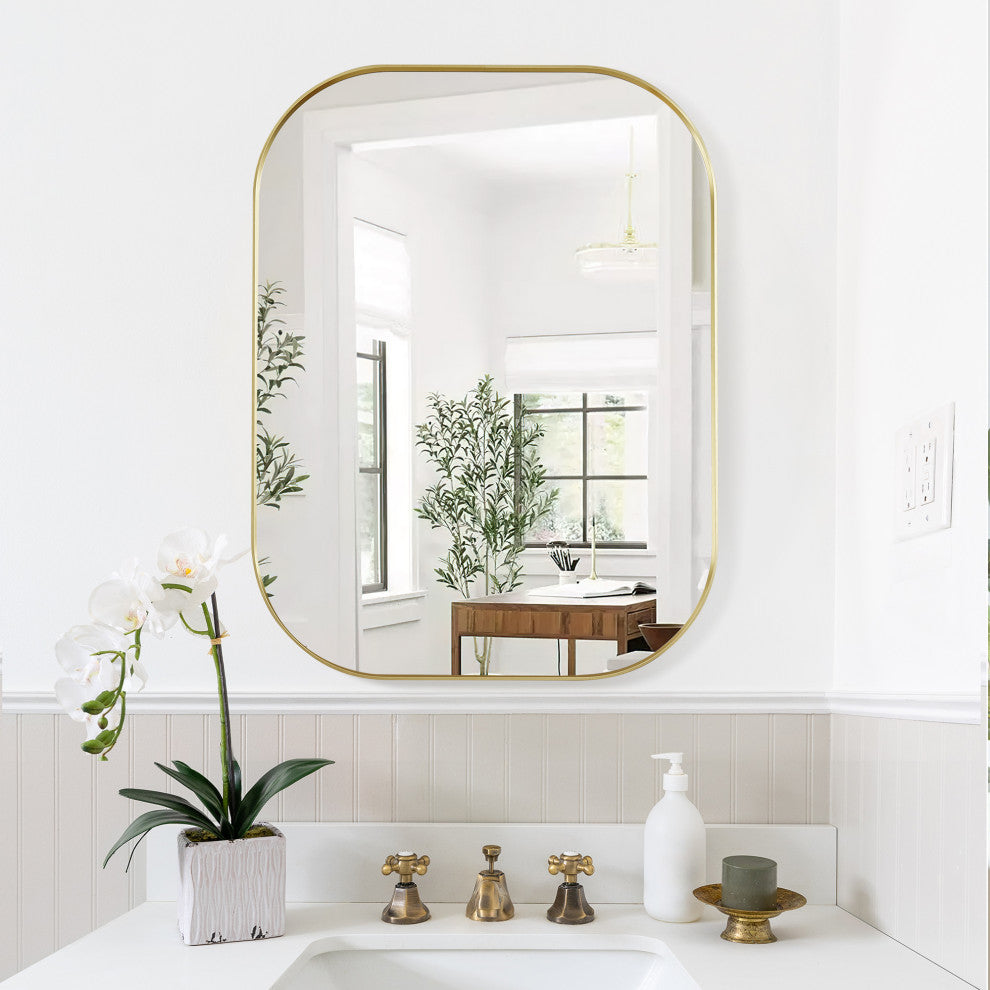 Whether hung in your guest washroom or master bath, our Trielle Wall Mirror adds a polished touch to any space. The sleek, rectangular design enhances the flow of natural light, making the room feel more expansive. The rounded edges give it a unique yet sophisticated, modern aesthetic. Framed with a slim aluminum band, the mirror boasts a clean and elegant silhouette. For added convenience, our Trielle mirror comes equipped with a Z-bar hanger, providing a versatile and effortless installation.FeaturesCrafted with a durable aluminum frame and an anodized coating, this mirror is both rust- and corrosion-resistantThe fully sealed metal frame enhances stability, ensuring a longer lifespan and superior durability.Mirror is available in Matte Black, Brushed Gold and Gunmetal finish to match and enhance your décor.The 5mm copper-free mirror features a safety film on the back that prevents glass shards from scattering in the unlikely event of breakage.The smooth curves enhance its refined look while providing a timeless appeal.Mounting brackets are included for both vertical and horizontal installation.Minimal assembly required. Installation instructions, hardware, and mounting bracket are included on the back.Designed to suit your preferences, this mirror complements a variety of décor styles, including modern, glam, industrial, farmhouse, and rustic.Perfect for any room, this mirror can be installed in your bathroom, living room, bedroom, dressing room, hallway, and moreFull Warranty: 1-Year Manufacturer Warranty"”purchase with peace of mind.