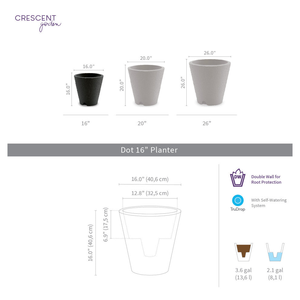 Simple and sleek, the Dot Textured Planter from Crescent Garden makes a lovely addition to your indoor or outdoor gardening area. The double-wall planter helps insulate the roots of your plants when the temperature shifts from cold to hot, preserving the longevity of the plant''s life. Created for the over-waterer, the under-waterer, the first-time gardener or the savvy enthusiast, the TruDrop system feature allows your plants to better survive the outdoors, without the need of watering, depending on your plant selection and planter size.