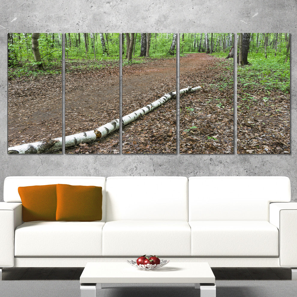 "Trunk of Birch On The Track" Contemporary Landscape Wall Art, 5 Panels, 60"x28"