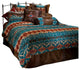 Walk the dusty trails of the Southwest, where native tribes sculpt, weave, and polish nature''s raw elements into exquisite art. Our Turquoise Chamarro set takes you through the thrilling vistas of red rock country; colors are inspired by red monoliths, smooth, rusty sandstone, and the blue-green tones of the finest turquoise, all grounded in rich, brown earth. To the Din?, turquoise represents happiness, luck, and health?the right combination for your relaxation! Bed skirt is tailored, faux suede with antique brass rivet accents. Turquoise Chamarro and faux suede euro shams with faux leather fringe and Conchos, zipper closure. Turquoise Chamarro and faux suede shams, with embroidered dot accents and real turquoise stones, zipper closure. Neckroll is faux leather center, Turquoise Chamarro ends, with embroidered dots and faux leather fringe.Twin Set Includes: Comforter: 67"x89"; Bed skirt: 39" x 75" x 15"; 1 sham: 20" x 27"; 1 pillow: 14" x 26"
