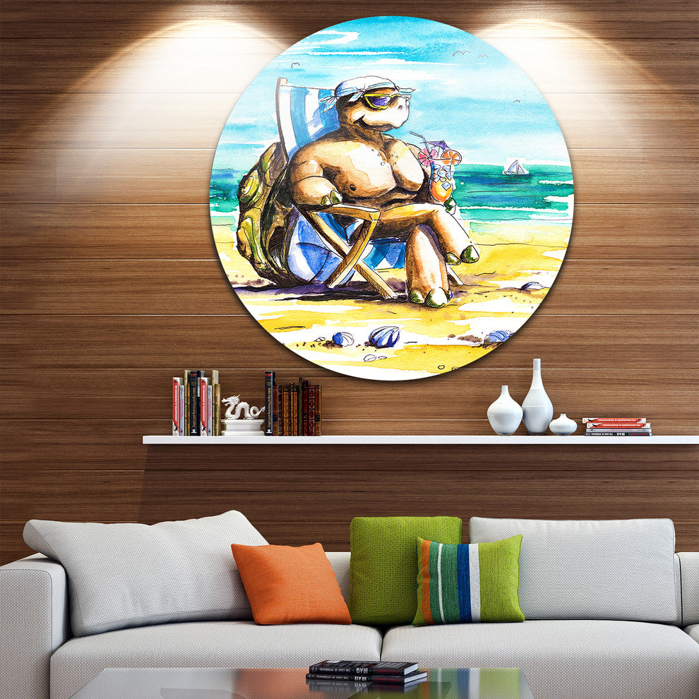Bring Contemporary Abstraction to your home with this large Circle Metal wall art. This Turtle Enjoying Holidays on Beach Metal Artwork makes it the focal point of any room or office.