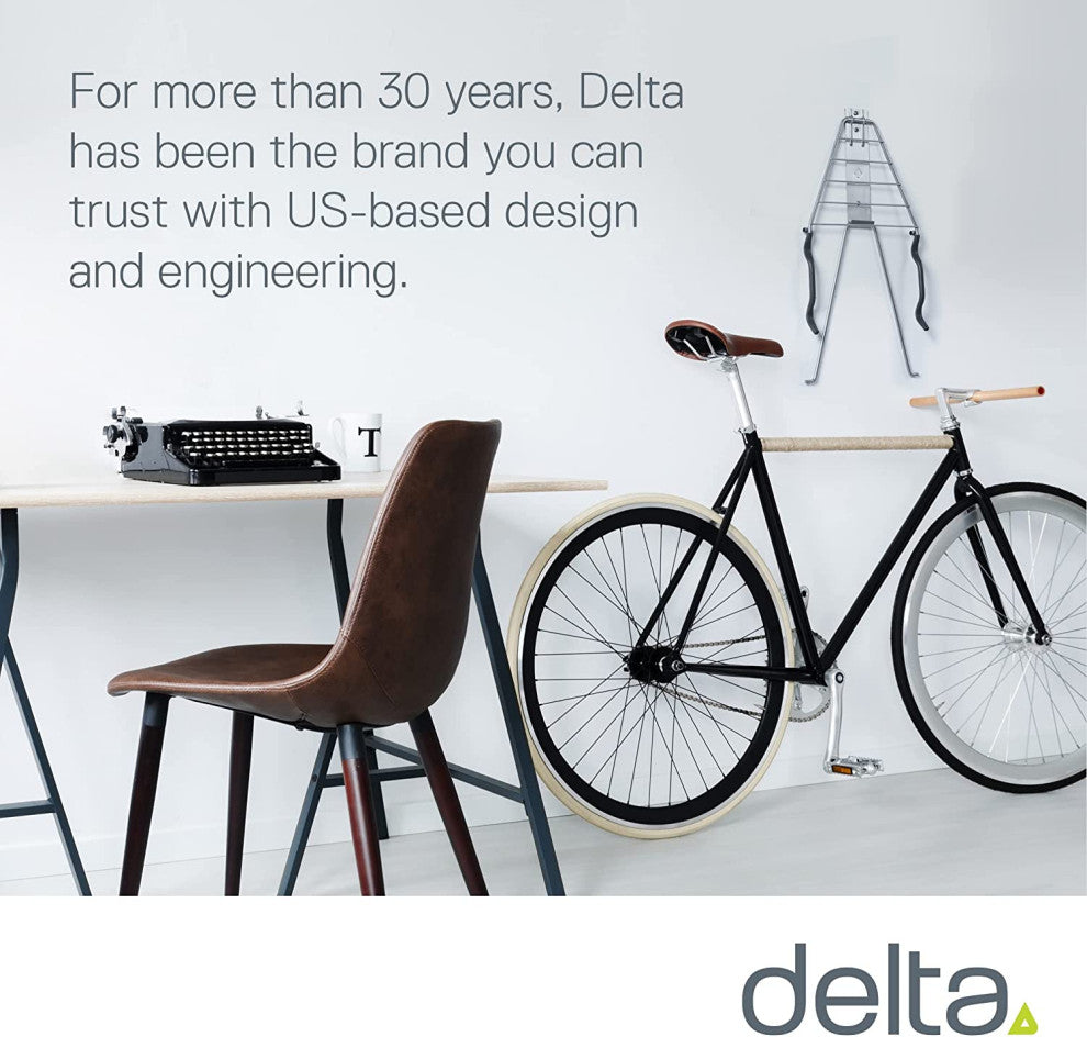 A Simple and Elegant Bike Storage Rack That Looks Good In Any RoomDelta"™s innovative and unique Pablo bike rack wall mounted bicycle storage solution that free up space even in the smallest of rooms. The Pablo horizontal garage bike rack wall mount accommodates two bikes up to 65lbs and features an integrated storage shelf and hanger hooks for your helmet, shoes, and bike accessories. A true space saver, the Pablo conveniently folds down flat when not in use to free up even more room. Easily installed into any wood stud, all mounting hardware is included and supported by our US-based customer service team, making setup of your new bicycle rack pain-free. This bike wall rack features durable steel material construction finished in a long lasting silver powder coat. Padded rubber arm hangers protect your bike"™s finish and prevent damage. Featuring an innovative and attractive design that delivers easy on/off access, the Pablo seamlessly compliments any decor. Your favorite hobby is always within reach while delta"™s proprietary wall bike mount, ensuring your assets are well protected and accessible, but never in the way.