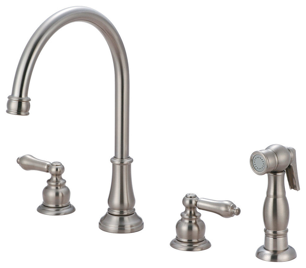 Two Handle Kitchen Widespread Faucet Metal Lever Handles Hi-Arc Gooseneck Spout Swivel 360 degrees 8-1/16" Reach, 7-1/8" from Deck to Aerator Ceramic Disc Cartridges 4-Hole 6" to 16" Installation Side Spray Assembly With 1.5 GPM Flow Rate