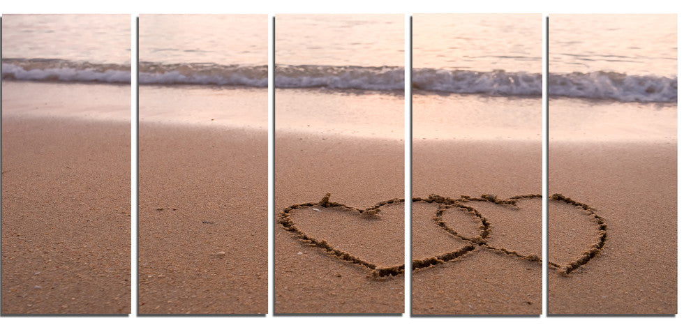 "Two Hearts Drawn on The Beach" Seascape Art Canvas, 5 Panels, 60"x28"