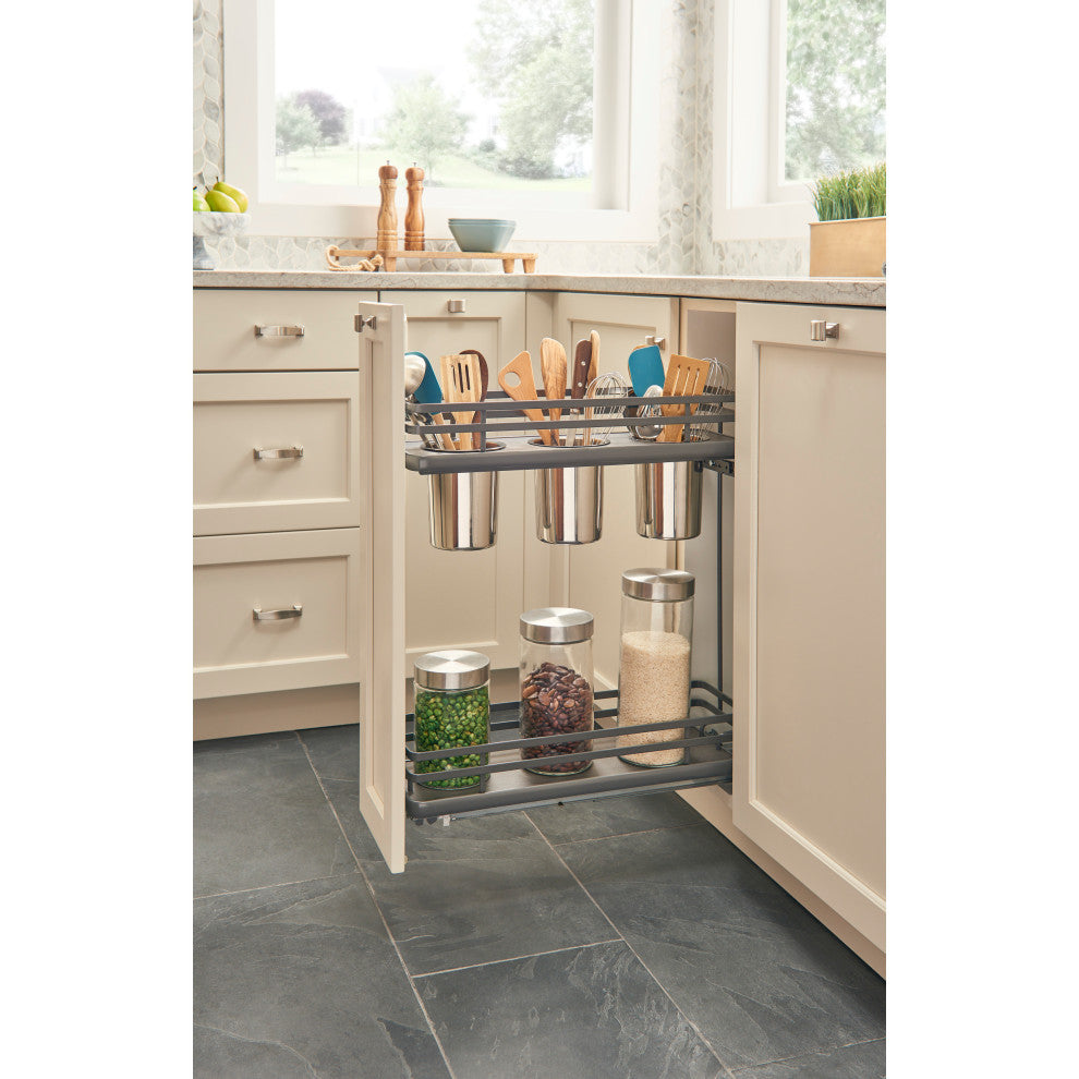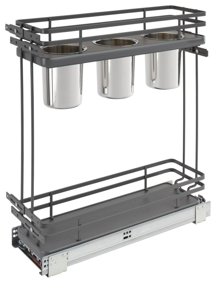 Bring the elegance with this chic design into your home with the Rev-A-Shelf 5322 Series designed for frameless (full-access) cabinets. This Two-Tier Base Organizer combines clean lines, modern flat wire accents, and beautiful Orion Gray finish creates a striking piece of organizational technology. Features patented door mount brackets, Blum soft-close slides system and heavy duty construction.-Included: (1) Two-Tier Organizer, (1) pair of Slides, (3) Chrome bins, mounting hardware-Slide Type: 110lb Full-Extension BLUMOTION Slides w/Soft-Close-Fully assembled and fits into an existing full height cabinet-3 chrome bins give flexibility to hold anything-Shelves are not adjustable-Shelf color is Gray-Designed for a 9" Frameless cabinet with 7.25" opening-Door mount brackets: Adjustable door mount brackets are Included: and required for operation-Construction: Heavy-Duty Metal frame with solid bottom surface-Mounts to cabinet floor and attach existing cabinet door
