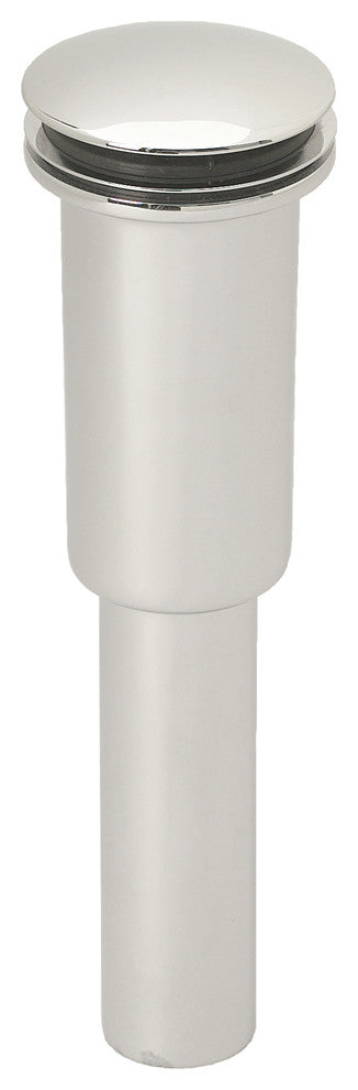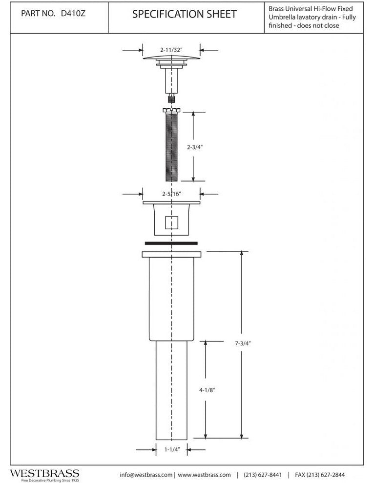 Umbrella lavatory drain does not close. This design replace grid-style lavatory drains, but does not suffer from slow or stopped drainage. This drain has overflow drain holes in its drain cup; however, its unique design allows it to be used on sinks without overflow. The drain is fully finished below the sink, and the screw mounting system makes it ideal for extremely thin or very thick sinks. Fully finished for exposed installation. Fits sinks up to 2-3/4 in. thick with an opening of 1-1/2 - 1-5/8 in. opening. Uses a 1-1/4 in. tailpiece. Heavy brass construction