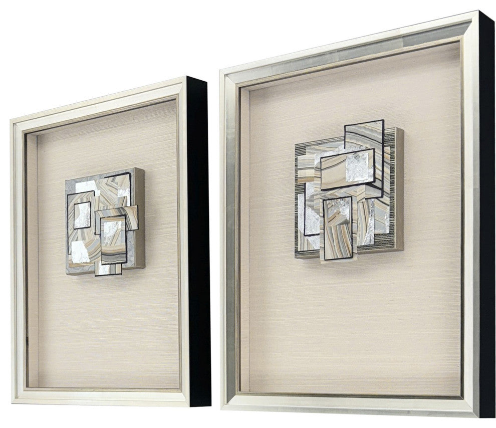Exclusive mixed media collage with handmade papers and silver leaf accents. Framed in a silver leaf wood shadow box with gold wash edging.