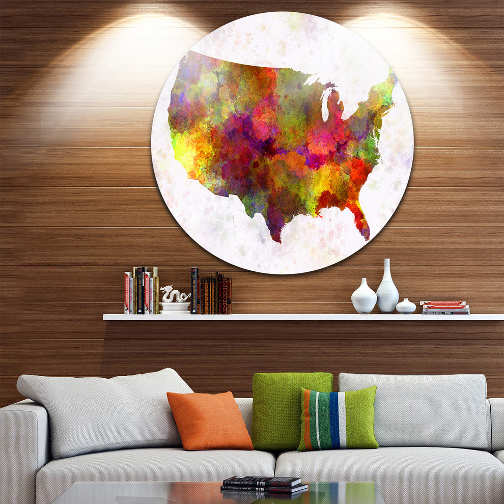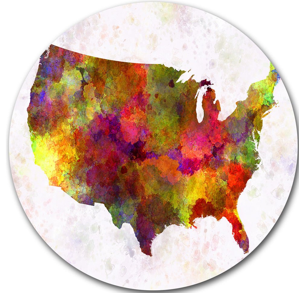 United States Map In Colors, Watercolor Painting Round Wall Art, 23"