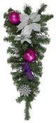 Realistic artificial pine swag is beautifully embellished with silver glittered eucalyptus, snowflake and ball ornament, as well as silver fabric poinsettias. Also accented with a matte purple ball ornament, and purple glittered finial Features long needle pine throughout with a mixture of two-tone PVC branch tipsFeatures: Unlit 2"-4" wide tips Bendable wire center allows for you to easily shape the swag and accommodate your decorating needs For indoor use only No assembly required ? swag comes in 1 pieceDimensions: 24" long x 16" wide Material(s): PVC/plastic/foam/metal/fabric