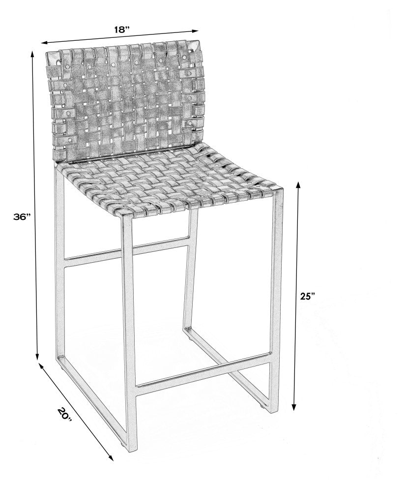 With its solid iron base, premium leather, and decorative metal nail head accents, this exquisitely crafted counter stool exudes a charming rustic allure. Made of Iron, Genuine Leather, Steel Metal Nail Heads Constructed of a 100% powder-coated iron frame with sled feet and a footrest bar and features a woven strap seat and seat back secured with leather that''s secured by steel nail heads Item arrives fully assembled Item dimensions are 17.75"W x 20"D x 36.25"H and stool weighs 19 lbs Seat measures 18"W x 19.5"D and is 25"H from the floor Seat back measures 18"W x 11"H Foot rest to floor measures 7.5"H Weight Capacity is 275 lbs Ideal for use as a counter stool in a kitchen and dining room setting Clean the frame with a damp cloth and spot treat leather with a mild and pure soap. Suggested to use a genuine leather cleaner and conditioner twice a year to maintain condition. Leather has inherent disparities in color. Variations in shade and markings are normal and can be expected.Photo may slightly differ from actual item in terms of color/finish due to the lighting during photo shoot or the monitor''s display.