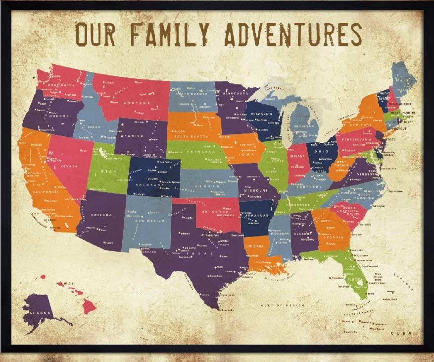 A beautiful rendering of USA in all it''s glory! I have tried to evoke a colorful vintage charm with this map. This is a one of a kind map, that is printed on gorgeous luster paper and is then mounted on foam and FRAMED with a color of your choice. You will not see this anywhere else. Exclusive colors and rendering. Mark your travels by pinning the places you have been or dream of going to. The US States are clearly defined and lists many popular cities.------------------------------------------------------------------------------------------------------------------------------SPECS------------------------------------------------------------------------------------------------------------------------------• Printed on smooth luster paper and mounted on foam. • Framed with a color of your choice (8 frames to choose from, Please refer to image)For 20X24 Inches and smaller, the frames will be aprrox. 1-1.5 inch.• Wire hooks included. Ready to hang outside the box. (Please note, Nail and Wire not included)• Glass or plexi is not in the frame and not needed due to the pins added. If you need glass, please let me know and I can arrange it for you for an extra charge• Includes a box of 100 assorted colored pinsWould you like to add more text or personalize with names to make it unique? I will do it at no extra charge. Please message me if you want to add names or text.This Listing is for a 20X24 Inches map. Want other sizes? please ask.------------------------------------------------------------------------------------------------------------------------------BARNWOOD FRAME INFO:The Rustic frames are REAL salvaged barn wood and have the natural rustic elements intact in most of them. You can expect knots, splintering and a distressed look in almost all of them...this is NOT a defect and this adds to the natural charm of this frame. Sometimes the BROWN wood can also look BROWN GRAY. Colors shift a little in the barn wood series. I also offer smooth wooden frames, if you want a more consistent modern look. Please choose from the menu. I personally love the rustic series. Thank you.