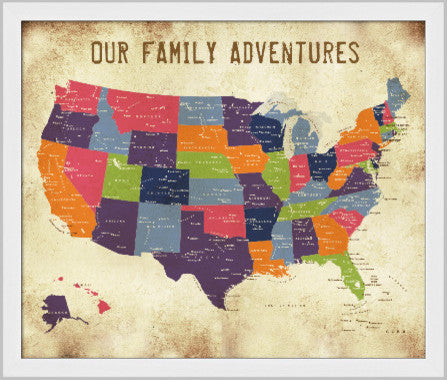 A beautiful rendering of USA in all it''s glory! I have tried to evoke a colorful vintage charm with this map. This is a one of a kind map, that is printed on gorgeous luster paper and is then mounted on foam and FRAMED with a color of your choice. You will not see this anywhere else. Exclusive colors and rendering. Mark your travels by pinning the places you have been or dream of going to. The US States are clearly defined and lists many popular cities.------------------------------------------------------------------------------------------------------------------------------SPECS------------------------------------------------------------------------------------------------------------------------------• Printed on smooth luster paper and mounted on foam. • Framed with a color of your choice (8 frames to choose from, Please refer to image)For 20X24 Inches and smaller, the frames will be aprrox. 1-1.5 inch.• Wire hooks included. Ready to hang outside the box. (Please note, Nail and Wire not included)• Glass or plexi is not in the frame and not needed due to the pins added. If you need glass, please let me know and I can arrange it for you for an extra charge• Includes a box of 100 assorted colored pinsWould you like to add more text or personalize with names to make it unique? I will do it at no extra charge. Please message me if you want to add names or text.This Listing is for a 20X24 Inches map. Want other sizes? please ask.------------------------------------------------------------------------------------------------------------------------------BARNWOOD FRAME INFO:The Rustic frames are REAL salvaged barn wood and have the natural rustic elements intact in most of them. You can expect knots, splintering and a distressed look in almost all of them...this is NOT a defect and this adds to the natural charm of this frame. Sometimes the BROWN wood can also look BROWN GRAY. Colors shift a little in the barn wood series. I also offer smooth wooden frames, if you want a more consistent modern look. Please choose from the menu. I personally love the rustic series. Thank you.