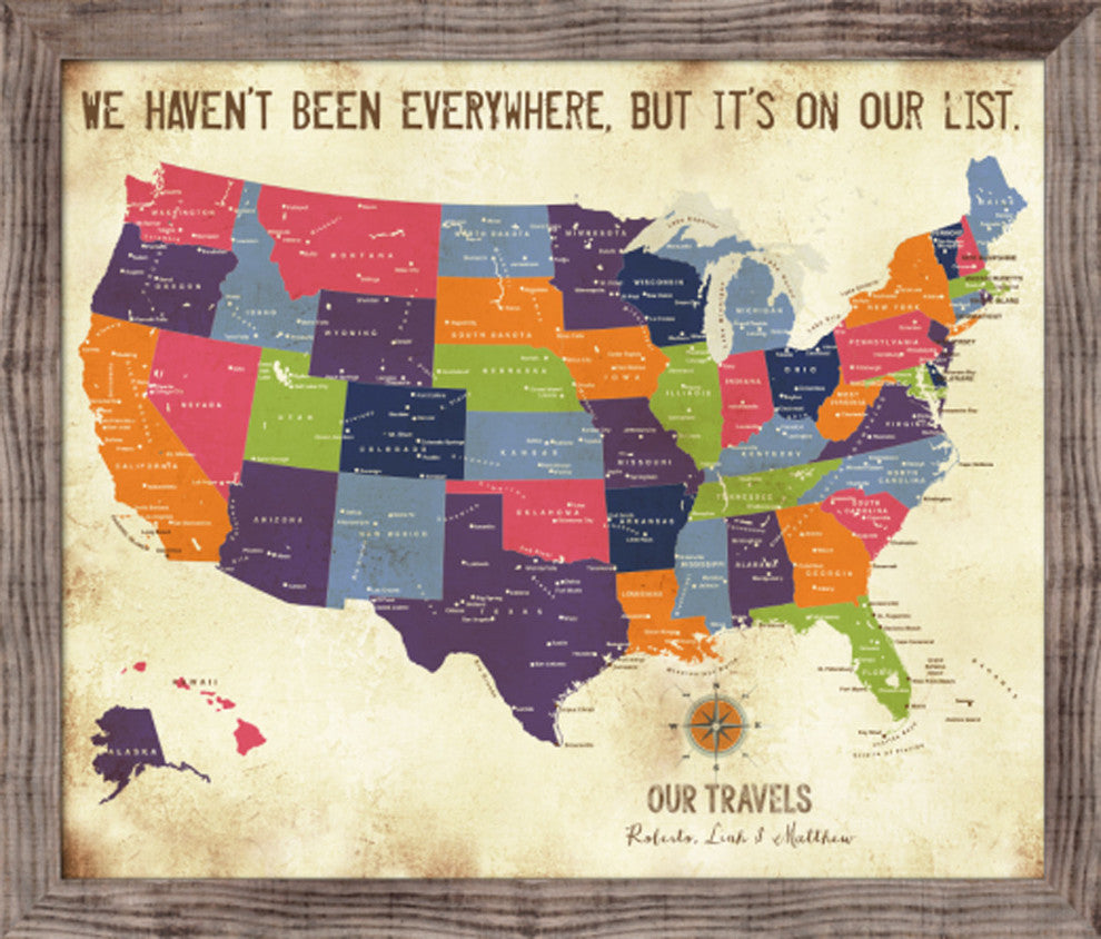 A beautiful rendering of USA in all it''s glory! I have tried to evoke a colorful vintage charm with this map. This is a one of a kind map, that is printed on gorgeous luster paper and is then mounted on foam and FRAMED with a color of your choice. You will not see this anywhere else. Exclusive colors and rendering. Mark your travels by pinning the places you have been or dream of going to. The US States are clearly defined and lists many popular cities.------------------------------------------------------------------------------------------------------------------------------SPECS------------------------------------------------------------------------------------------------------------------------------• Printed on smooth luster paper and mounted on foam. • Framed with a color of your choice (8 frames to choose from, Please refer to image)For 20X24 Inches and smaller, the frames will be aprrox. 1-1.5 inch.• Wire hooks included. Ready to hang outside the box. (Please note, Nail and Wire not included)• Glass or plexi is not in the frame and not needed due to the pins added. If you need glass, please let me know and I can arrange it for you for an extra charge• Includes a box of 100 assorted colored pinsWould you like to add more text or personalize with names to make it unique? I will do it at no extra charge. Please message me if you want to add names or text.This Listing is for a 20X24 Inches map. Want other sizes? please ask.------------------------------------------------------------------------------------------------------------------------------BARNWOOD FRAME INFO:The Rustic frames are REAL salvaged barn wood and have the natural rustic elements intact in most of them. You can expect knots, splintering and a distressed look in almost all of them...this is NOT a defect and this adds to the natural charm of this frame. Sometimes the BROWN wood can also look BROWN GRAY. Colors shift a little in the barn wood series. I also offer smooth wooden frames, if you want a more consistent modern look. Please choose from the menu. I personally love the rustic series. Thank you.