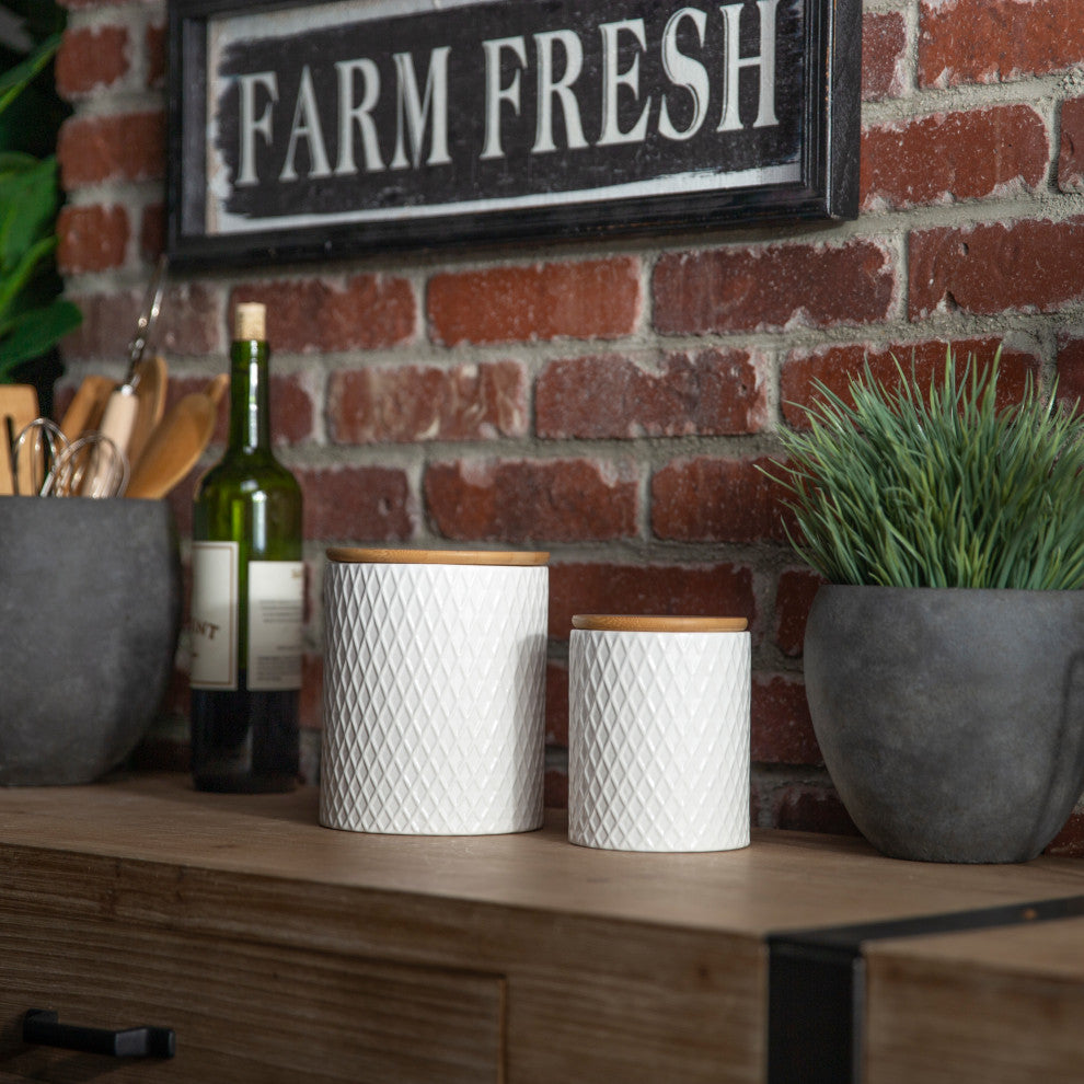 UTC canisters are made of the finest ceramics which makes them tactile and attractive. They are primarily designed to accentuate your home, garden or virtually any space. Each canister is treated with a coated finish that gives them rigidity against climate change, or can simply provide the aesthetic touch you need to have a fascinating focal point!! • Ceramic Round Canister with Brown Top Lid and Diamond Pattern Design Body Set of Two Coated Finish White• Brand: Urban Trends Collection• Material: Ceramic• Color: White• Item Size: 5.25"x5.25"x6.75"H; 4.00"x4.00"x5.25"H• UPC: 190563509581• For Decorative Purposes Only• Does Not Hold Water