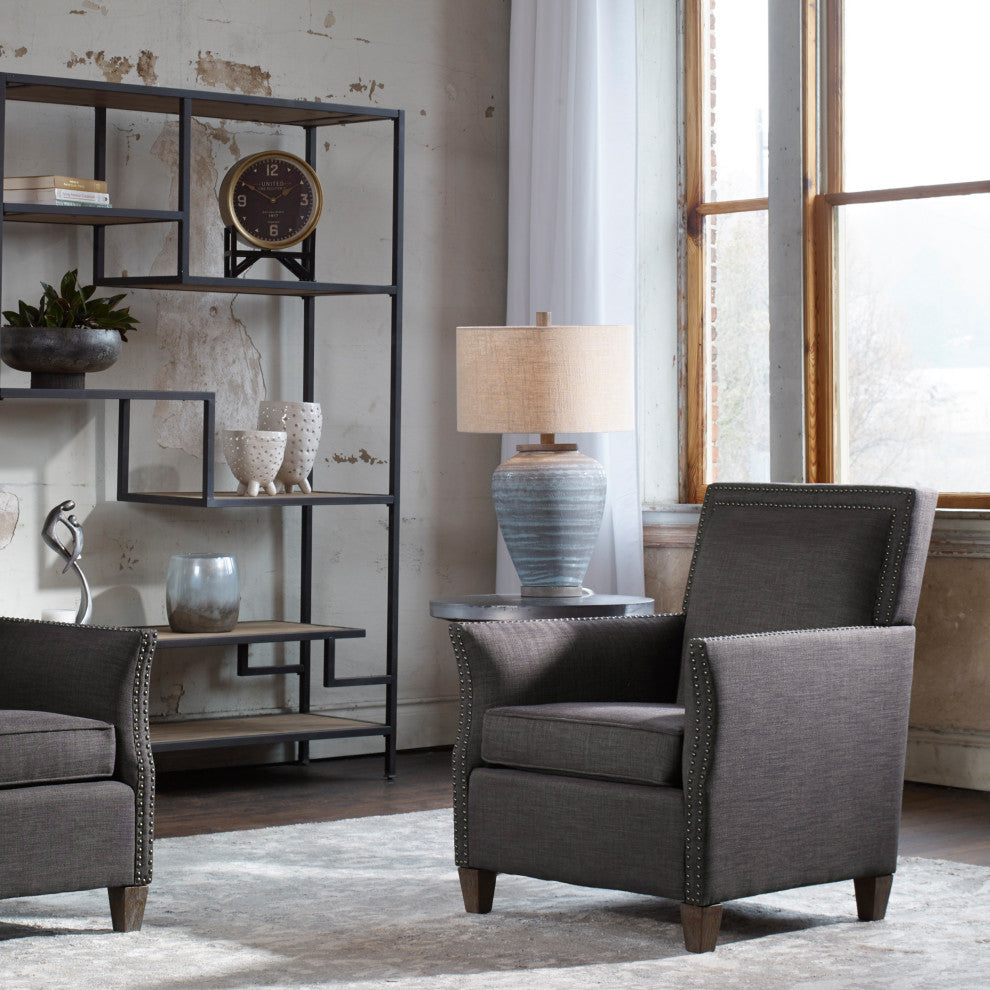 This table lamp design features a ceramic base with a global, bohemian flair, finished in a light aqua blue crackle glaze with light gray textured pattern. The foot and neck have a porous texture, finished in a warm concrete look. A hardback drum shade in beige linen fabric with natural slubbing completes this piece.