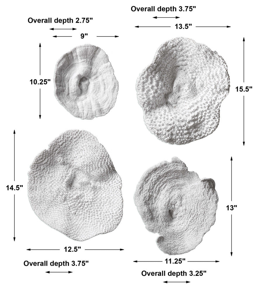 The Uttermost Sea Coral Wall Art brings coastal-inspired style into your décor. This set of 4 coral replica hangings in antique white add beauty to any room. They may be hung on a wall, with attached hangers, or displayed as table top accessories.