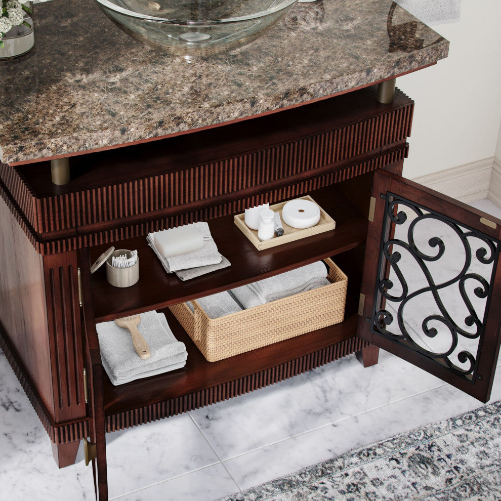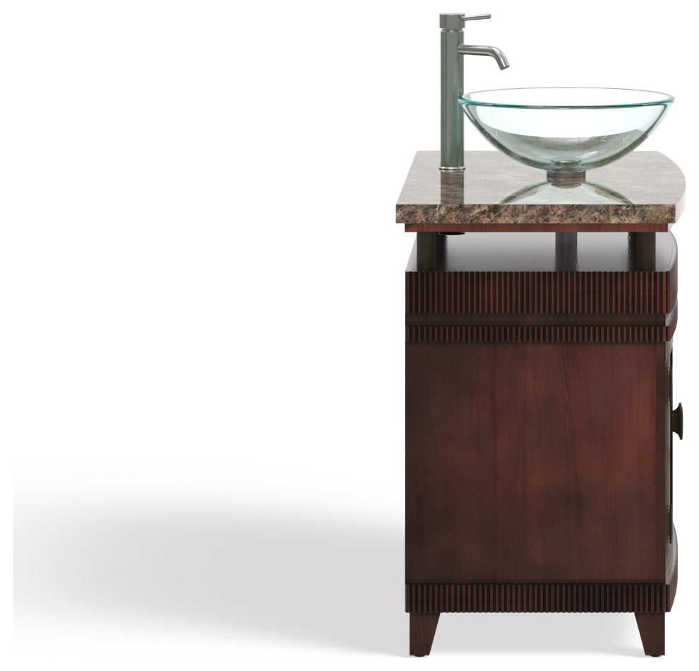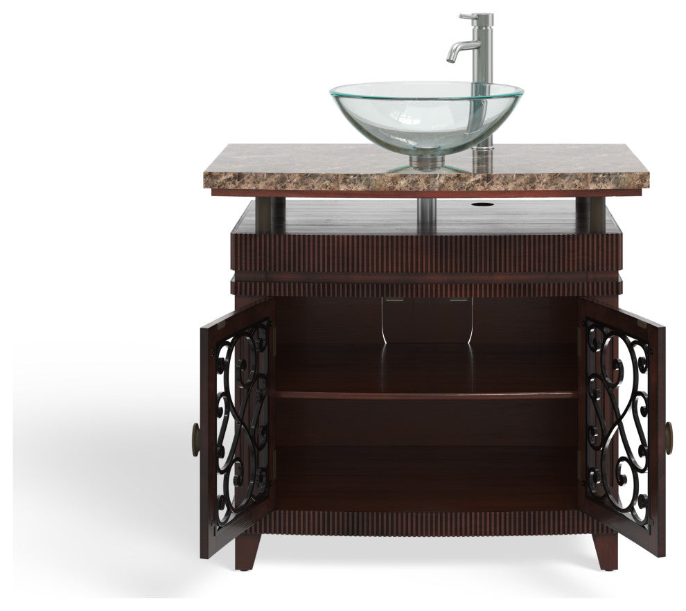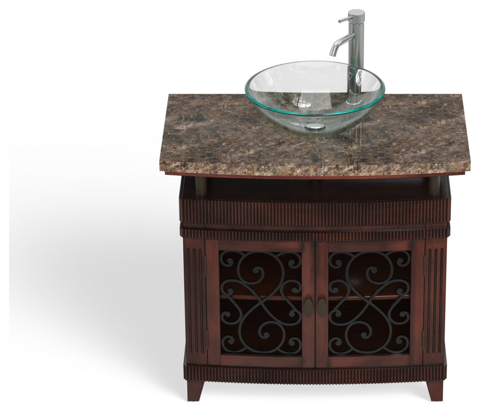 A solid "œ10" on the luxury scale, the traditional Valencia vanity is all about the details"”and they"™re all included (yes, even the polished chrome faucet!). In one mighty showpiece you"™ll get solid wood construction with a warm mahogany finish, a glass vessel sink that lets the hand-polished marble shine through, and cast metal doors reminiscent of old world design. It"™s a conversation piece for the ages that will have guests gushing over your distinguished, high-end taste.Includes countertop, vessel sink, hardware, and faucetApproximate dimensions: 36x20.5x32.25"H Medium brown mahogany finishGenuine brown marble countertop (one piece)Storage compartment with half shelvesSimple assembly requiredDue to the nature of natural stone, it''s normal for countertops and sinks to have variations in color and texture, including discolored spots, pores, veins or other birthmarks and imperfections. These are not considered defects. To avoid any dirt or stains from getting into the stone, we highly recommend you to seal any stone surfaces before installation.Residential Curbside Delivery :Rates include curbside delivery by truck lines for ONE unit within the contiguous 48 states. Transit time runs between 3-10 service days. Cargo is fully insured by the shipper (US) for damage during transportation. You can refuse cargo if the carton does not seem to be in good condition. R&L Carrier and SAIA Freight Line service deliver most of our cargo. All deliveries occur during the carrier"™s normal business hours with a 4-hour appointment window. Be sure to provide your correct shipping address, otherwise you will be responsible for any change of address fee charged by the carrier. Your order will be delivered via a freight carrier, usually by a 53'' semi-truck, which could easily weigh 20-40 tons. Some rural areas, islands, or otherwise inaccessible locations (deep hill, gravel road, long driveway, narrow road, private road, etc.) may not be deliverable by our contracted carriers. In some cases, carriers may be able to provide special arrangements (hiring a local moving company, renting a smaller truck for final delivery, etc.), however additional fees apply. Please feel free to contact us for details before purchasing.