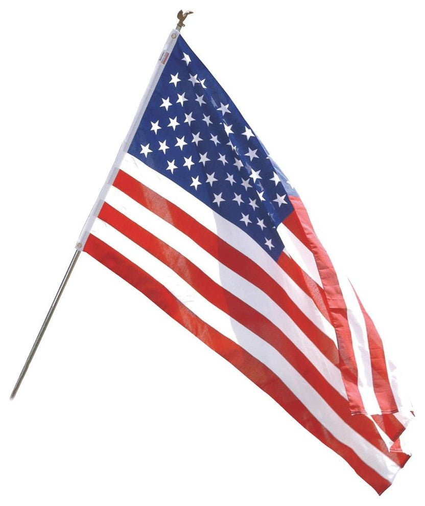 Set includes 3'' x 5'' printed polycotton flag, 6'' pole, gold plastic eagle, steel mounting bracket with screws; and standard, plastic, flag fasteners