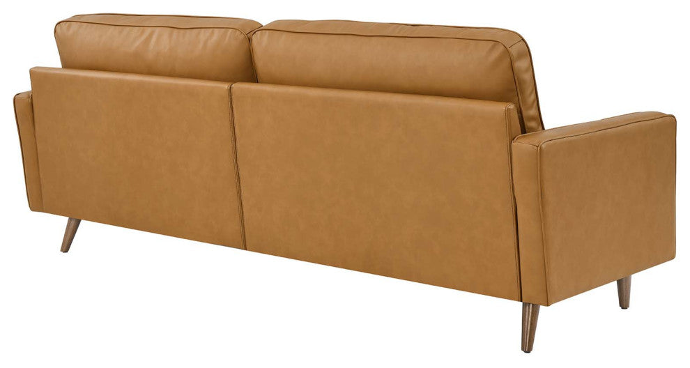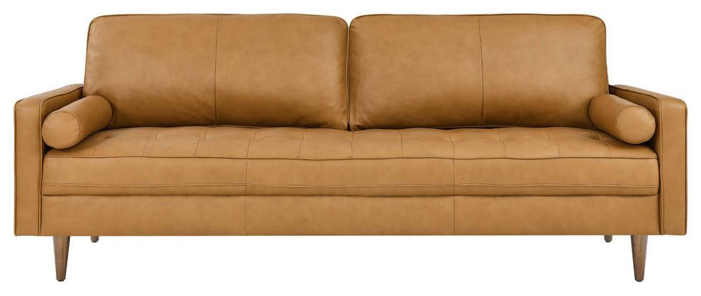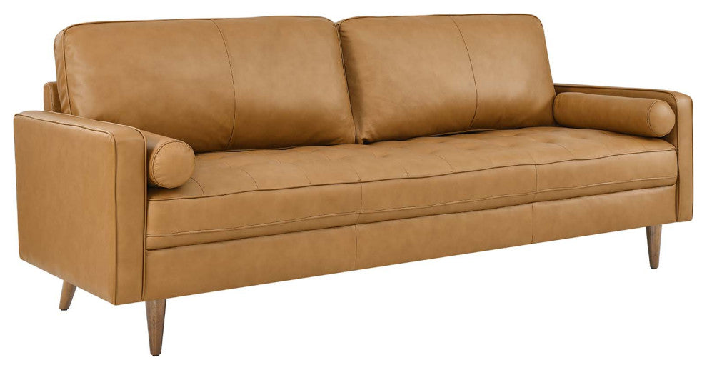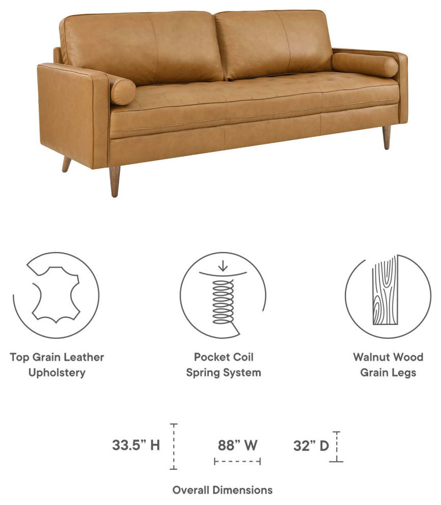 Update your home or apartment with the mid-century style and modern-day convenience of the Valour Leather 88" Sofa. This comfortable living room sofa features a tailored profile with elegant biscuit tufting and two bolster pillows. Covered in beautiful top grain leather upholstery, this sofa has dense foam padding, an innerspring pocket structure, and a sinuous spring support system for a comprehensive seating experience that fits perfectly into apartment settings. This luxe modern sofa comes with walnut-stained wood legs and non-marking foot caps to protect floors. Say goodbye to the days of hauling heavy furniture. This tufted plus-size sofa ships in a portable box for easy maneuvering. Weight limit: 990 lbs.Set Includes:One - Valour 88" Leather SofaMid-Century Modern SofaLeather UpholsteryInnerspring Pocket StructureDense Foam PaddingShips in a Convenient BoxAssembly RequiredSofa Weight Capacity: 990 lbs.Product Color : TanAssembly Required : YESOverall Product Dimensions: 32"L x 88"W x 33.5"HSeat Dimensions: 21"L x 81"W x 18"HArmrest Dimensions: 24.5 - 30"L x 3.5"W x 23.5"HBackrest Height: 14.5"HCushion Thichkness: 5.5"HProduct Weight : 116 lbs.Product Materials : Solid+zigzag spring, Vinyl: Skyline: top grain leather, Carb P2 plywood +solid wood, bottom is with black foot pins, Sofa Weight Capacity: 993lbs, 331lbs for each seat